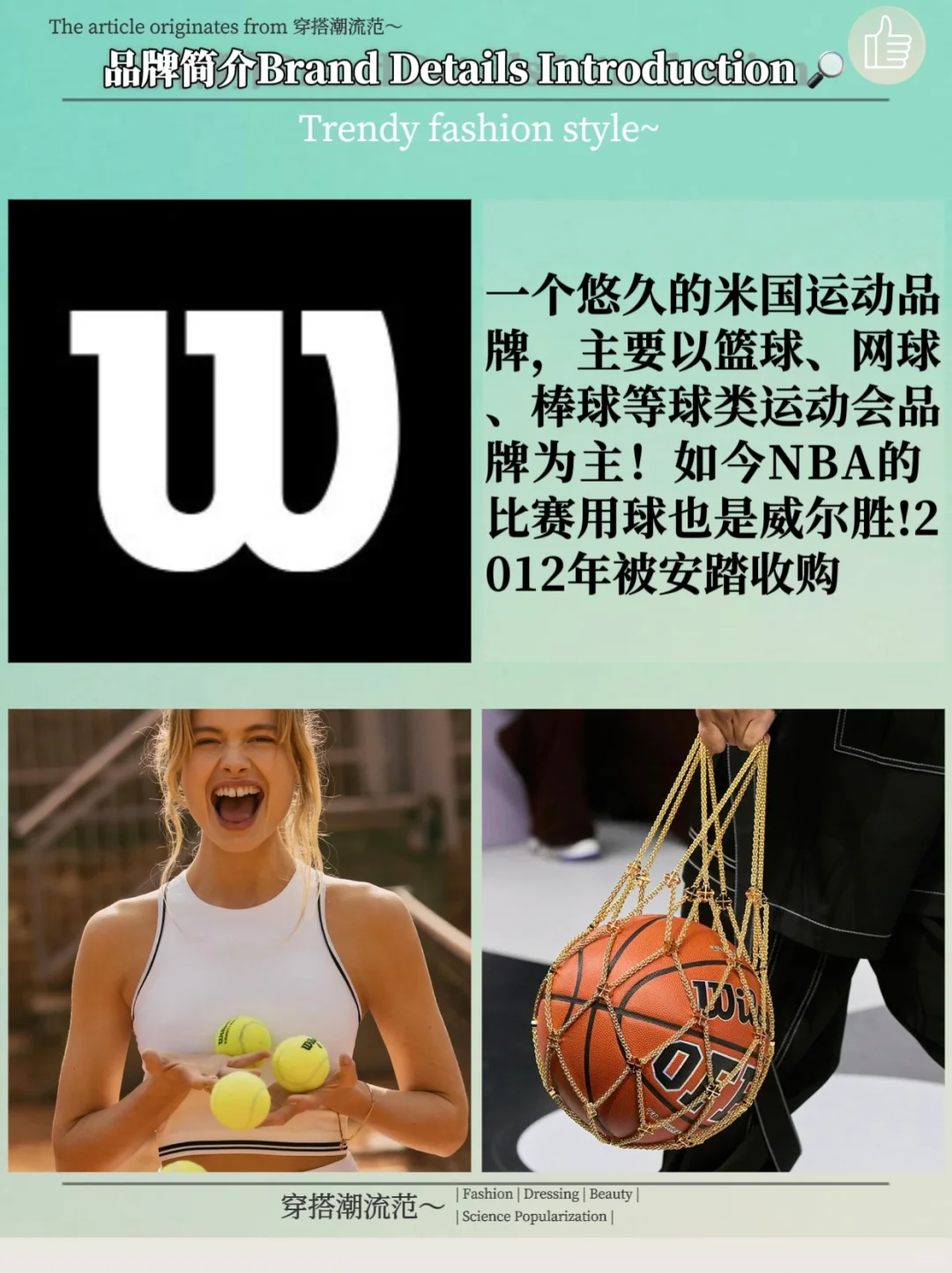 一个悠久的米国运动品牌,主要以篮球、网球、棒球等球类运动会品牌为主!如今NBA的比赛用球也是威尔胜!2012年被安踏收购