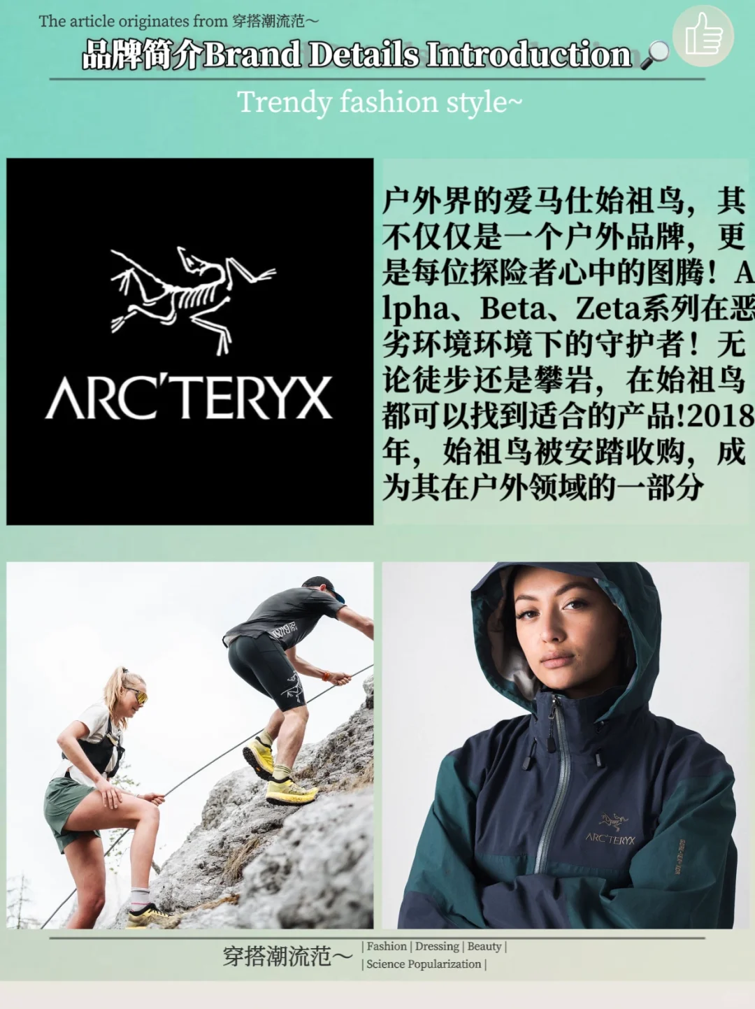 户外界的爱马仕始祖鸟,其不仅仅是一个户外品牌,更是每位探险者心中的图腾!Alpha、Beta、Zeta系列在恶劣环境环境下的守护者!无论徒步还是攀岩,在始祖鸟都可以找到适合的产品!2018年,始祖鸟被安踏收购,成为其在户外领域的一部分