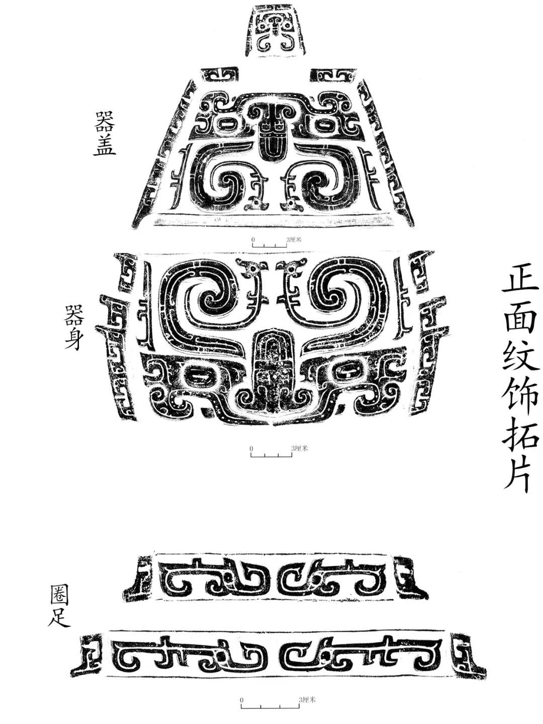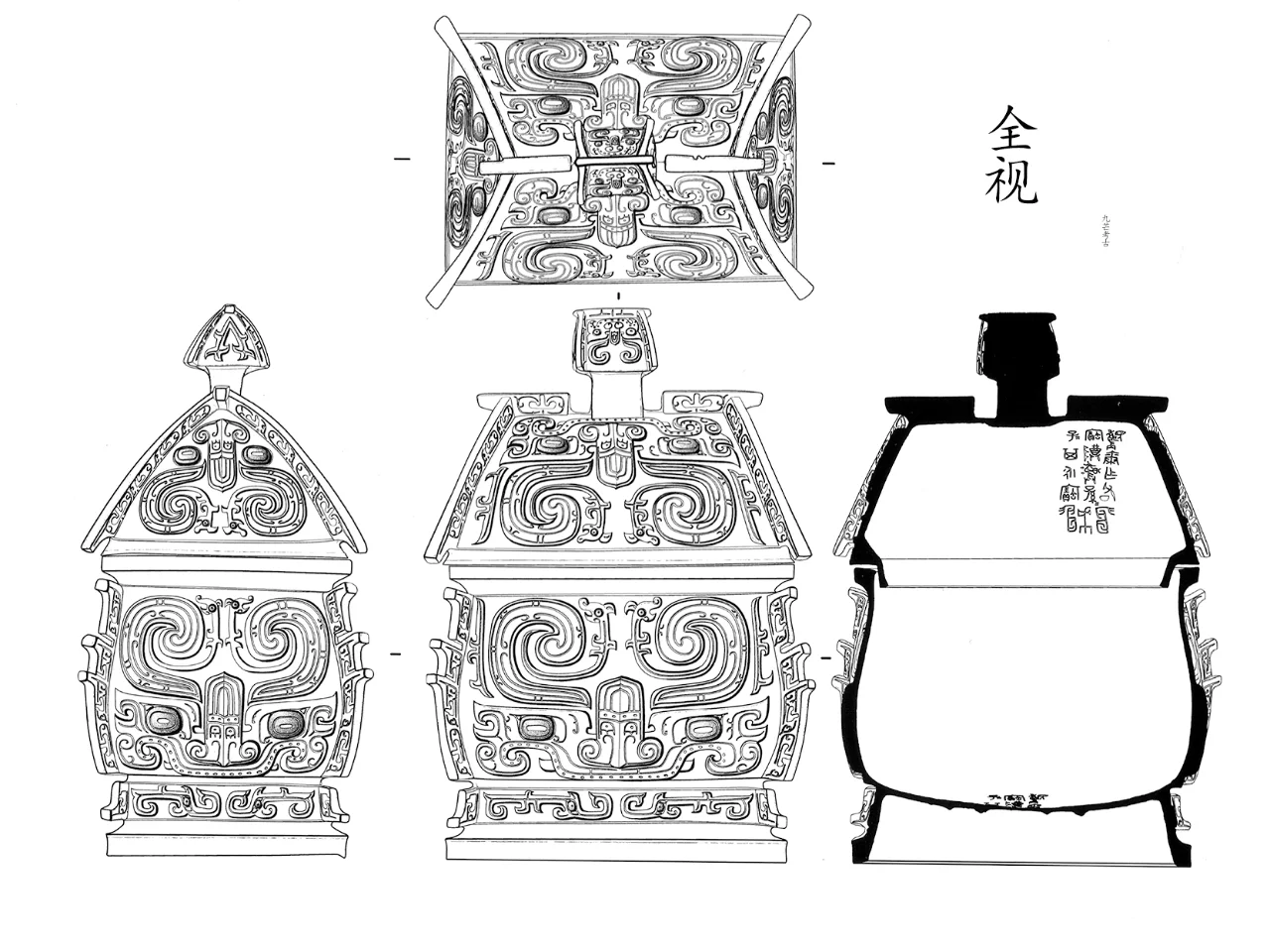 盖、器四角和盖面饰扉棱,盖面和器身四面各饰一组高浮雕大兽面,椭方目,目中间有一横向凹槽,双角上扬而内卷,角面饰三条并列阴线纹,耳面饰阴线云纹,鼻梁为一倒置蝉纹,鼻孔向外翻卷,鼻梁饰阴线云纹、鳞纹、和阴线纹,口两侧露出獠牙。圈足四面各饰两条象鼻夔纹。