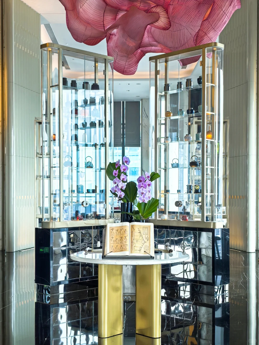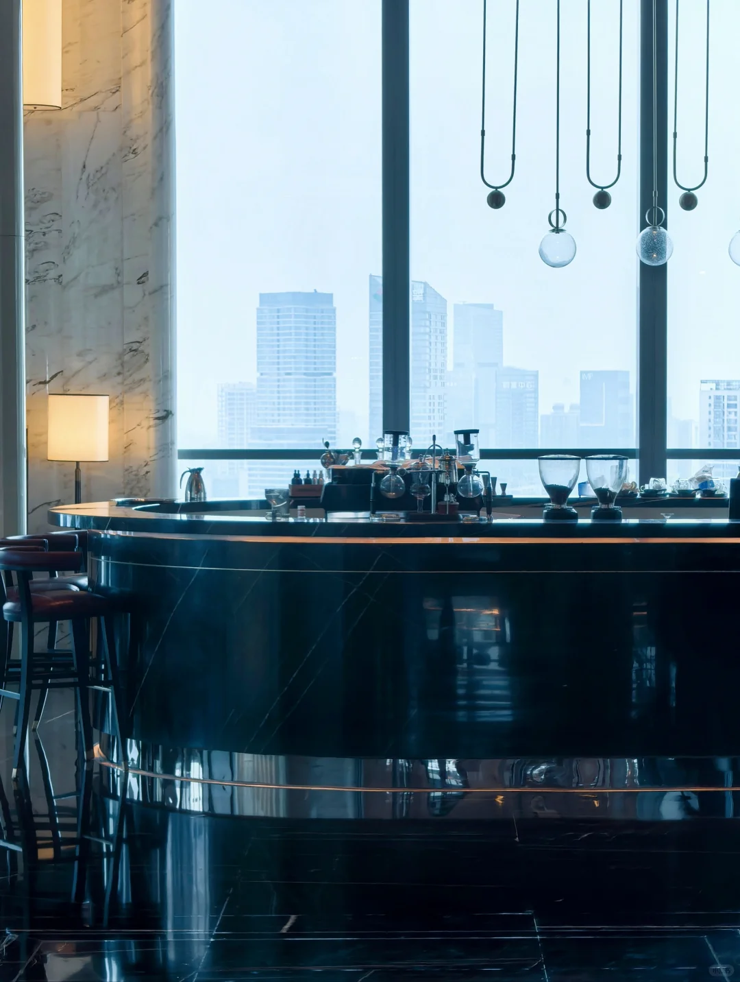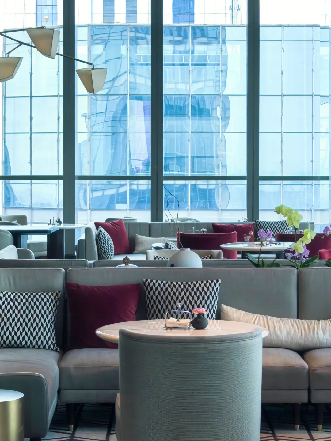 酒店因为刚开业三年,所以比较新。步入酒店后换乘电梯到38L的天际大堂办理入住。酒店大面积运用奢石,辅以艺术装置,奢华氛围营造得当。