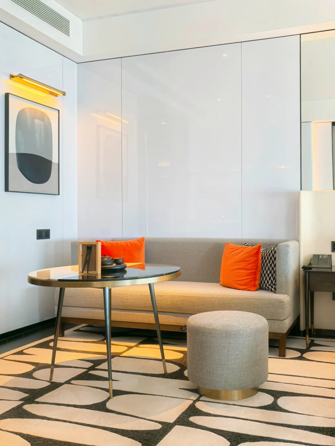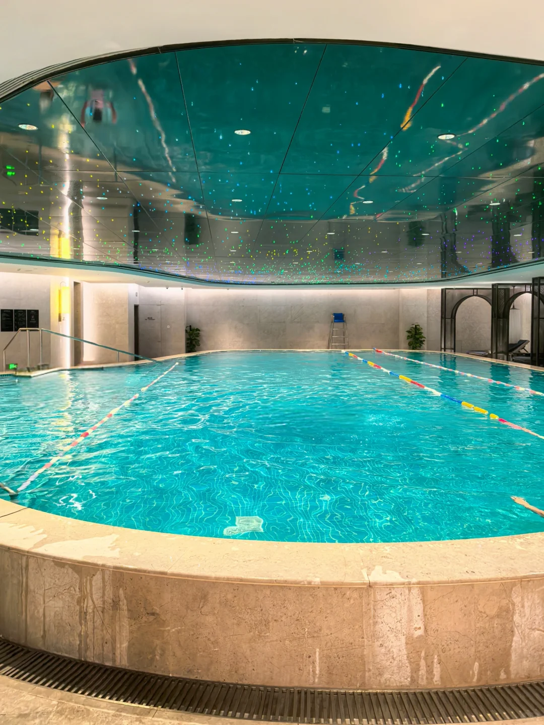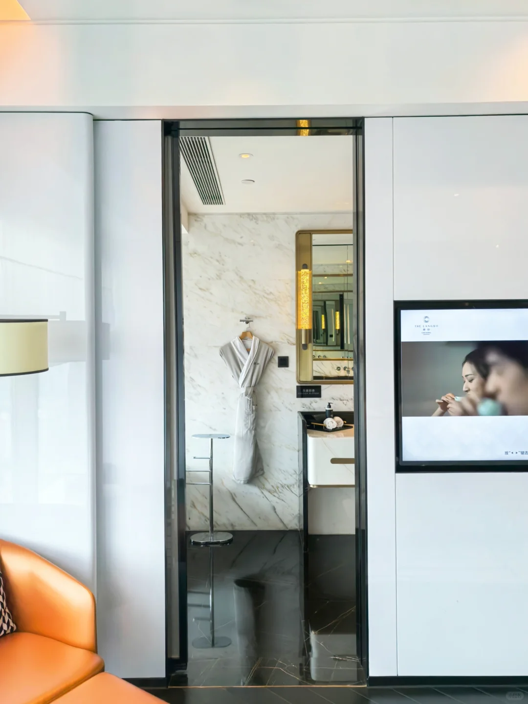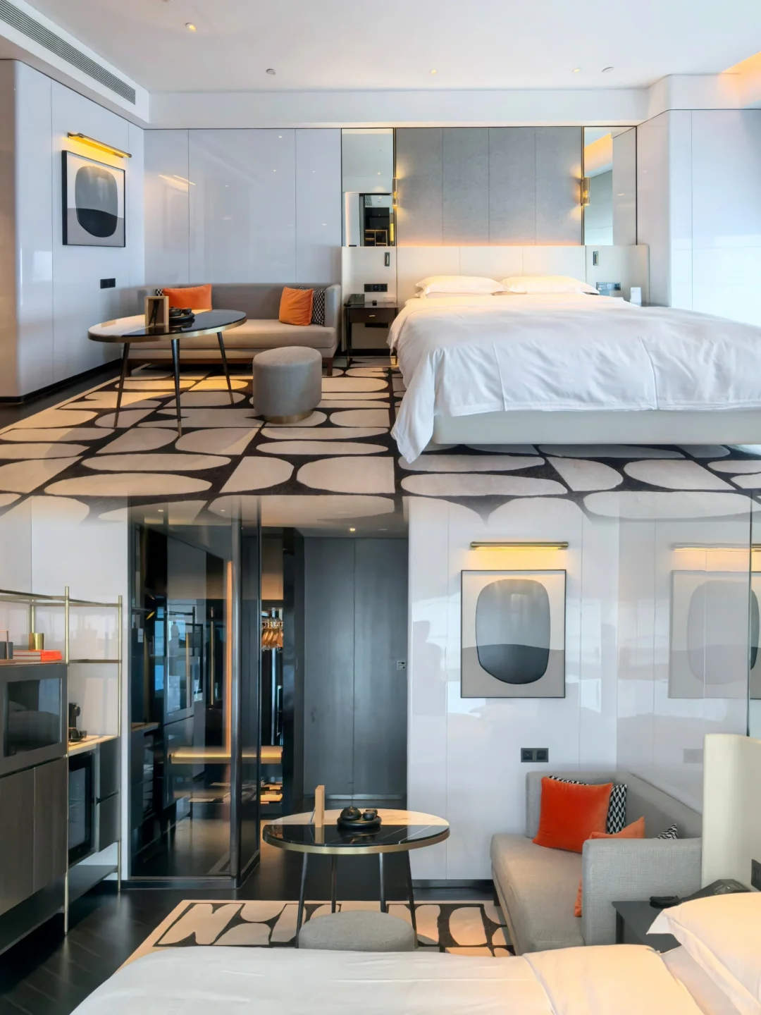 酒店因为刚开业三年,所以比较新。步入酒店后换乘电梯到38L的天际大堂办理入住。酒店大面积运用奢石,辅以艺术装置,奢华氛围营造得当。