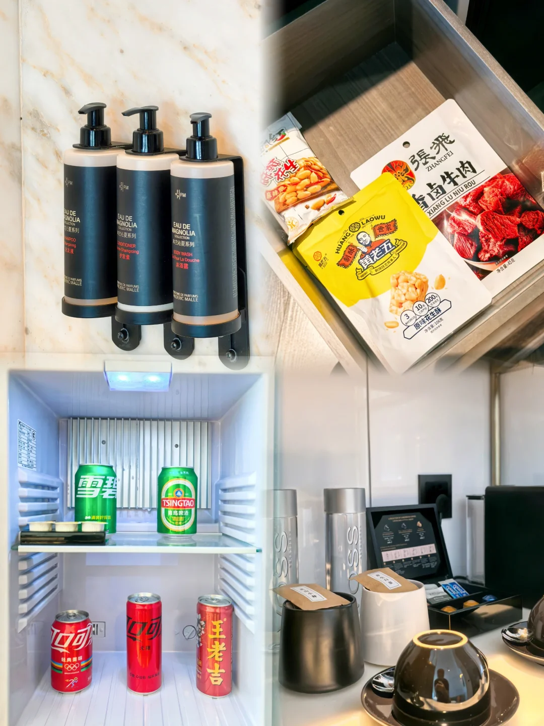 这家据说对环球客特别厚道。可惜我是白板,预定的是基础的珀玉大床房,但是基础房没想到开间就已经很大了,一进门左手边是洗手间带卫洗丽,右手边竟然做了一个步入式的衣帽间,再往前沙发茶几和minibar分列左右,值得一提的是这家基础房minibar就首轮免费包含饮料和小吃这点十分厚道,茶包是自己的但是无论是正山小种还是白茶品质都非常好比香料茶包可好太多了,配有的全套茶具也很漂亮,竹子镂空的茶盘很有成都特色。