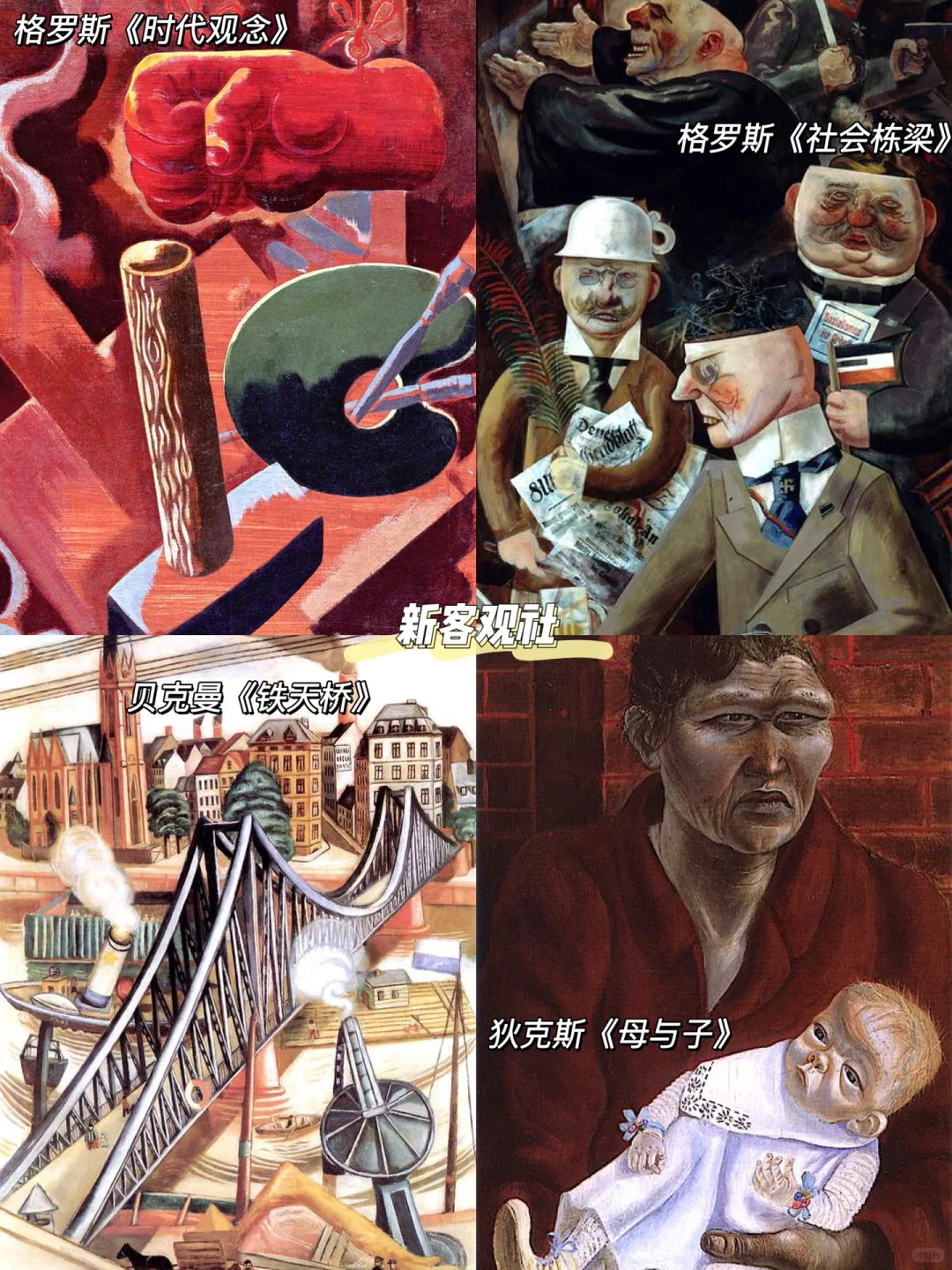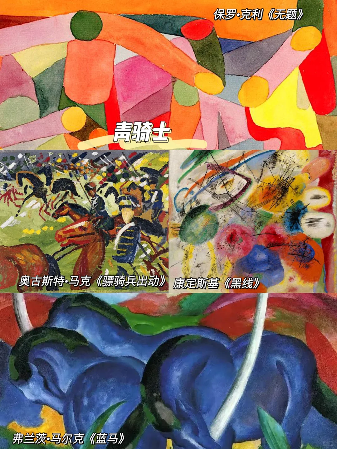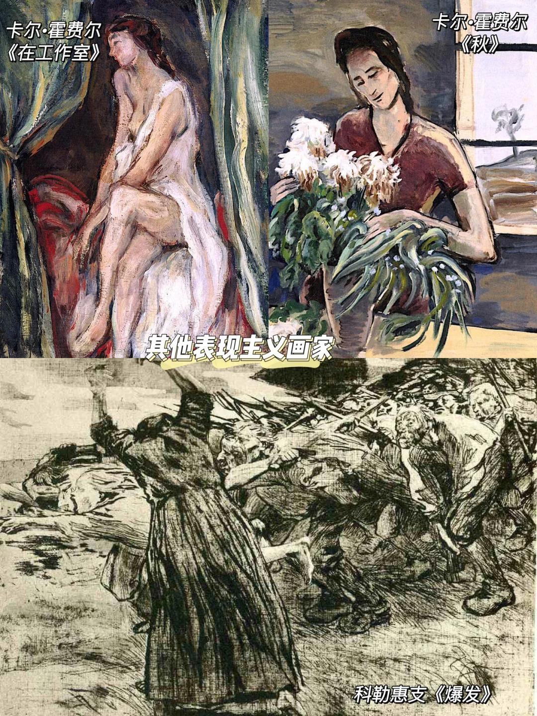 🔹诞生背景:表现主义诞生于20世纪初的德国,在战后创伤、社会动荡和文明危机中,画家们受到“以人为本”的存在主义、“生而为意志服务”的唯心主义和“万物存在即为上帝”的神秘主义等思想影响,开始否定客观世界,将主观感受付诸于笔下。 🔹表现主义:因此,我们能在相关作品中看到恐惧、焦虑、压抑、不安等高压负面情绪。它们在画者编排的梦魇里,通过阴沉的色彩、变形的姿态和挤压的空间,被数倍放大给观众。 🔹表现主义先驱:其实早在19世纪,艺术界就已出现“色彩+线条组合表达特定情感”的理论,并且,我们能在浪漫主义、新印象主义、新艺术运动、野兽派中,看到这种理论的实现。 而在德国,最早流露表现主义倾向的画家是罗尔夫斯、诺尔德和保拉。 🔹桥社:1905年,基希纳,赫尔克,罗特鲁夫组成了德表第一大团体:桥社。他们反对学院派和主流艺术,受中世纪艺术、非洲艺术、梵高、蒙克的影响颇深,通过聚焦社会问题,用画笔表达出当下的绝望感受。 其中基希纳的画,充斥着德式哥特的神秘;赫尔克的画;表现出悲观主题的探索;罗特鲁夫的画,挥洒下狂野奔放的性格;佩希施泰的画,则显现出野兽派色彩的影响。 🔹青骑士:1911年,康定斯基与马尔克成立青骑士,旨在挖掘表象背后的精神与艺术形式。康定斯基用抽象展现物质关联;弗兰茨.马尔克和奥古斯特.马克用动物描绘精神领域;保罗克利用色块搭建视野平衡。 🔹狂飙:同样在1911年,艺评家在《狂飙》杂志社,首次提出了表现主义一词,次年,这个词又被冠名到了青骑士展览中。 《狂飙》是德国表现主义的根据地,它诞生了两位重要艺术家,分别为风格狂放、笔触粗犷的科柯施卡和主题多为灾难、厄运与末世的迈德纳。 🔹其他:有些艺术家并未参与到团体中,但依旧是最杰出的表现主义画家,比如卡尔·霍费尔,他擅长肖像画,以色彩柔和但基调忧郁为特色。还有著名版画家珂勒惠支,她以工人阶级为题材,展现最直摄人心的情感。 🔹新客观 :新客观社在德国表现主义后期出现,是一个展览会的名称,提倡写实、客观,以战争、人性、社会议题为主,但可以用夸张、抽象的描绘手法。 代表画家格罗斯善长辛辣幽默的讽刺漫画;狄克斯常用客观眼光呈现残酷现实;贝克曼则更注重表现三维空间。