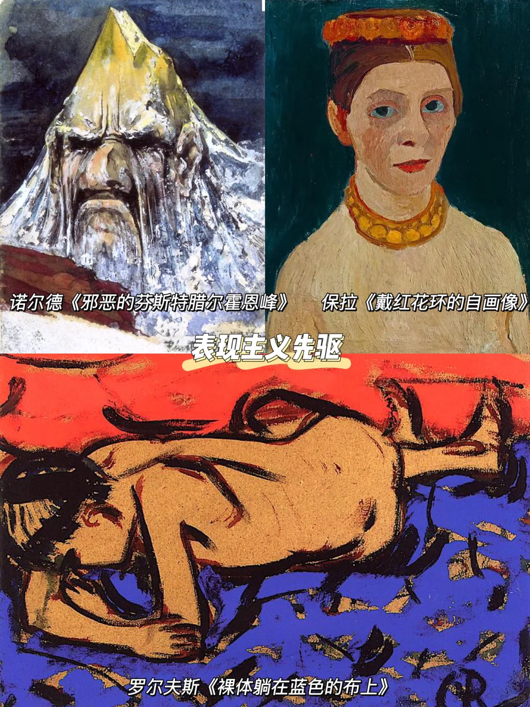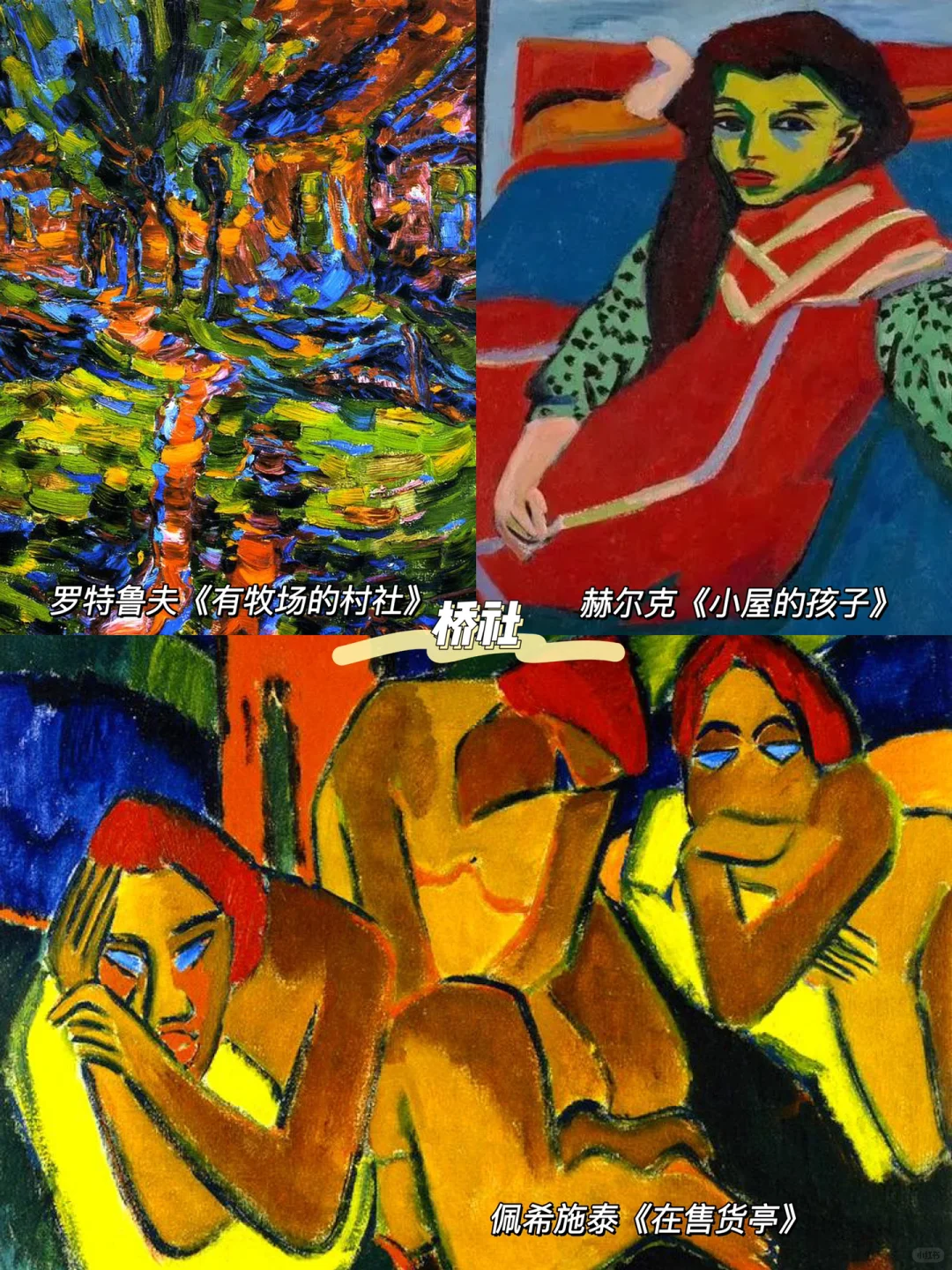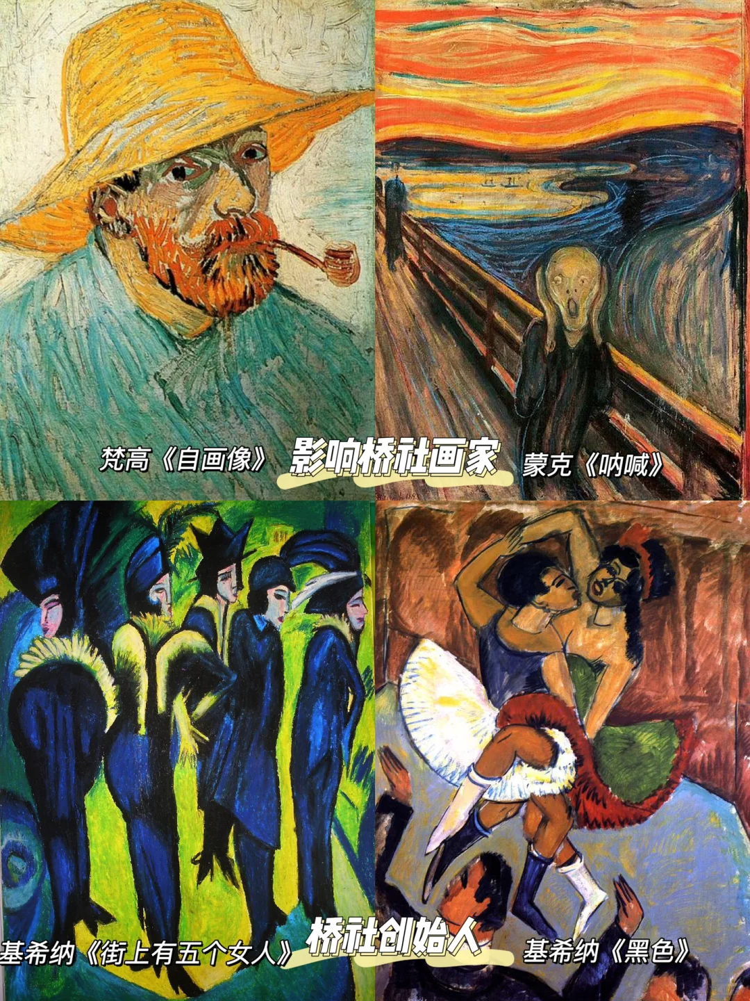 🔹诞生背景:表现主义诞生于20世纪初的德国,在战后创伤、社会动荡和文明危机中,画家们受到“以人为本”的存在主义、“生而为意志服务”的唯心主义和“万物存在即为上帝”的神秘主义等思想影响,开始否定客观世界,将主观感受付诸于笔下。 🔹表现主义:因此,我们能在相关作品中看到恐惧、焦虑、压抑、不安等高压负面情绪。它们在画者编排的梦魇里,通过阴沉的色彩、变形的姿态和挤压的空间,被数倍放大给观众。 🔹表现主义先驱:其实早在19世纪,艺术界就已出现“色彩+线条组合表达特定情感”的理论,并且,我们能在浪漫主义、新印象主义、新艺术运动、野兽派中,看到这种理论的实现。 而在德国,最早流露表现主义倾向的画家是罗尔夫斯、诺尔德和保拉。 🔹桥社:1905年,基希纳,赫尔克,罗特鲁夫组成了德表第一大团体:桥社。他们反对学院派和主流艺术,受中世纪艺术、非洲艺术、梵高、蒙克的影响颇深,通过聚焦社会问题,用画笔表达出当下的绝望感受。 其中基希纳的画,充斥着德式哥特的神秘;赫尔克的画;表现出悲观主题的探索;罗特鲁夫的画,挥洒下狂野奔放的性格;佩希施泰的画,则显现出野兽派色彩的影响。 🔹青骑士:1911年,康定斯基与马尔克成立青骑士,旨在挖掘表象背后的精神与艺术形式。康定斯基用抽象展现物质关联;弗兰茨.马尔克和奥古斯特.马克用动物描绘精神领域;保罗克利用色块搭建视野平衡。 🔹狂飙:同样在1911年,艺评家在《狂飙》杂志社,首次提出了表现主义一词,次年,这个词又被冠名到了青骑士展览中。 《狂飙》是德国表现主义的根据地,它诞生了两位重要艺术家,分别为风格狂放、笔触粗犷的科柯施卡和主题多为灾难、厄运与末世的迈德纳。 🔹其他:有些艺术家并未参与到团体中,但依旧是最杰出的表现主义画家,比如卡尔·霍费尔,他擅长肖像画,以色彩柔和但基调忧郁为特色。还有著名版画家珂勒惠支,她以工人阶级为题材,展现最直摄人心的情感。 🔹新客观 :新客观社在德国表现主义后期出现,是一个展览会的名称,提倡写实、客观,以战争、人性、社会议题为主,但可以用夸张、抽象的描绘手法。 代表画家格罗斯善长辛辣幽默的讽刺漫画;狄克斯常用客观眼光呈现残酷现实;贝克曼则更注重表现三维空间。