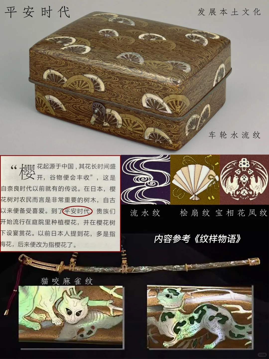 🌸到了平安时代,中国经历了晚唐衰微、五代十国混战以及北宋建立。而日本也停止了遣唐使,开始发展本土文化,樱花、🐱猫、🌊流水、桧扇等纹样代表高雅,出现在贵族使用的器物上。