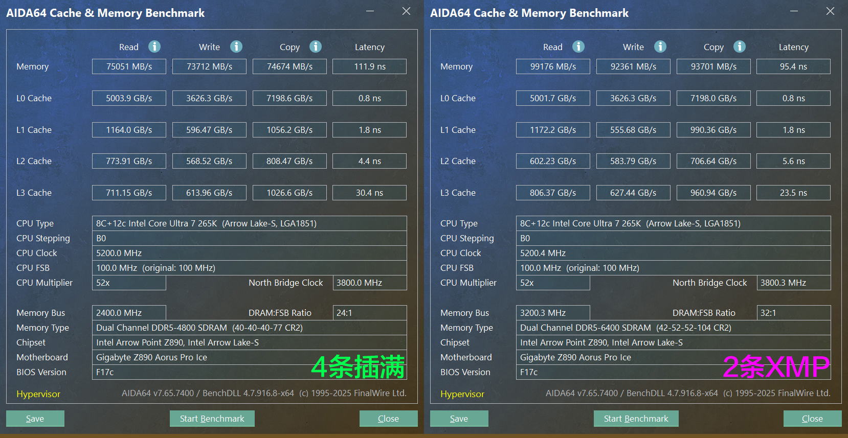 以我的这套海盗船复仇者128GB(64GBx2) 6400 MHz DDR5内存条为例,常规2条组双通道(64GBx2)就能完美运行,而插满4条(64GBx4)虽然能正常开机,却无法正常打开XMP 6400MHz,只能使用默认频率4800MHz运行。如此一来,相比双通道XMP的内存性能,插满4条时的读取速度损失约24%、写入速度损失约20%、拷贝速度损失约20%,延迟高了约17%。