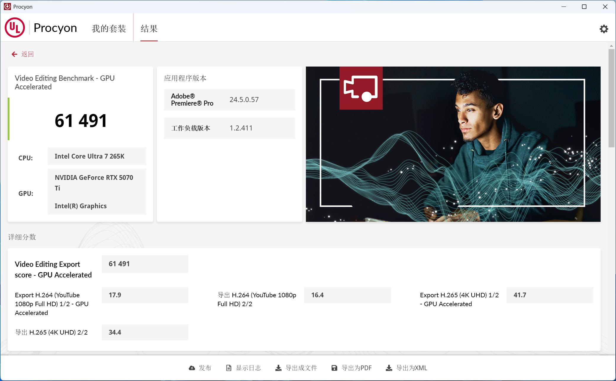 UL Procyon的视频编辑基准测试得分61491。这项测试在视频编辑工作流程中使用了Adobe Premiere Pro,首先导入两个视频项目文件,项目时间线上包括各种编辑、调整和效果;第二个项目使用多个 GPU 加速效果。每个视频项目会使用H.264编码的Full HD格式和HEVC (H.265)编码的4K UHD格式进行导出。