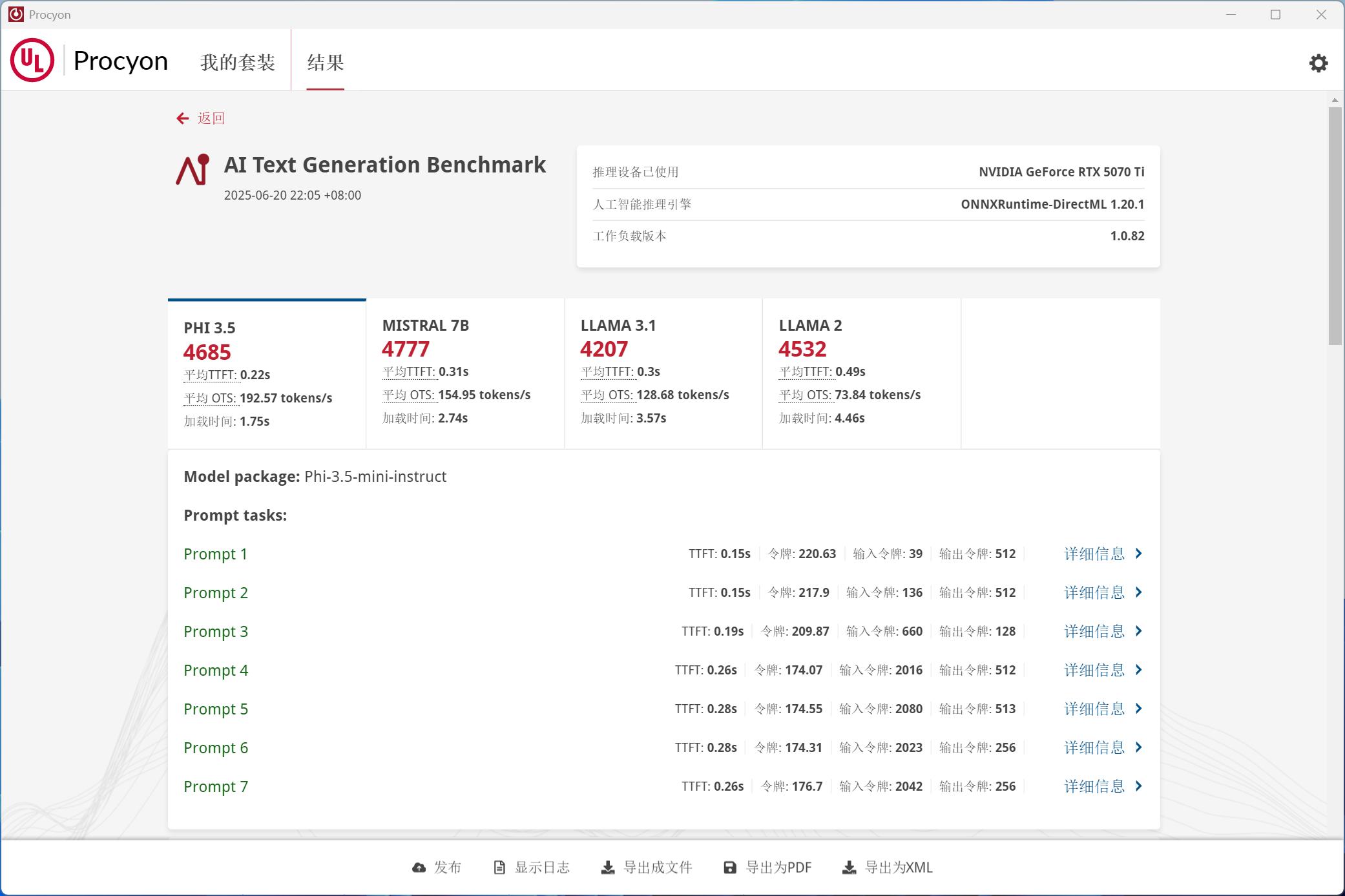 UL Procyon的AI Text Generation Benchmark可以反复且一致地测试多个LLM AI模型,测试的模型包括PHI 3.5 mini、MISTRAL 7B、LLAMA3.1 8B 和 LLAMA2 13B,使用OpenVINO运行测试。测试结果如下: