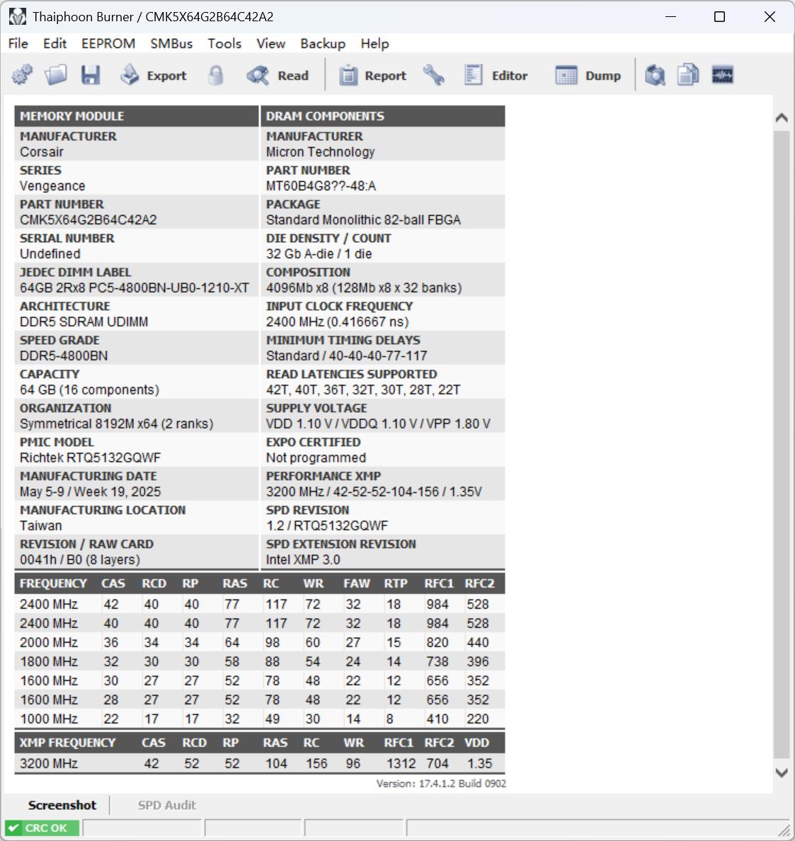 这套单根64GB大容量的海盗船复仇者采用美光A-Die颗粒,默认频率4800MHz,时序40-40-40-77,支持intel XMP技术,可一键超频至6400MHz,时序42-52-52-104。同时,它还配备定制高性能PCB板,有助于保证信号的完整性,减少高频信号传输中的干扰和衰减,这对DDR5 高速内存来说至关重要。