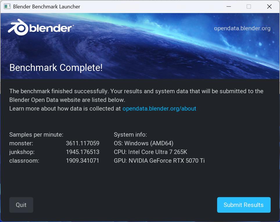 最后是Blender Benchmark测试,Blender是一款3D设计软件,提供从建模、动画、材质、渲染、到音频处理、视频剪辑等一系列动画短片制作解决方案,同时也可以创作广播和电影级品质的视频。