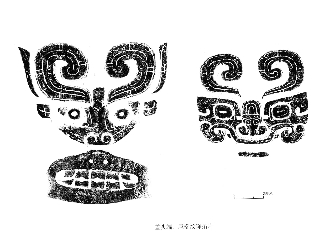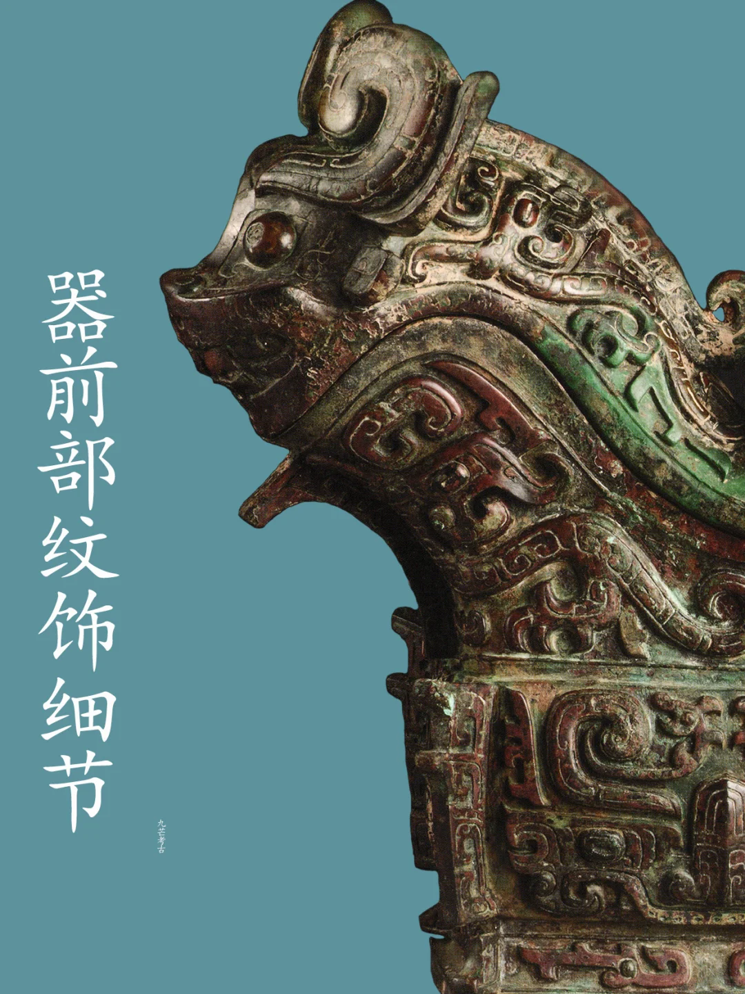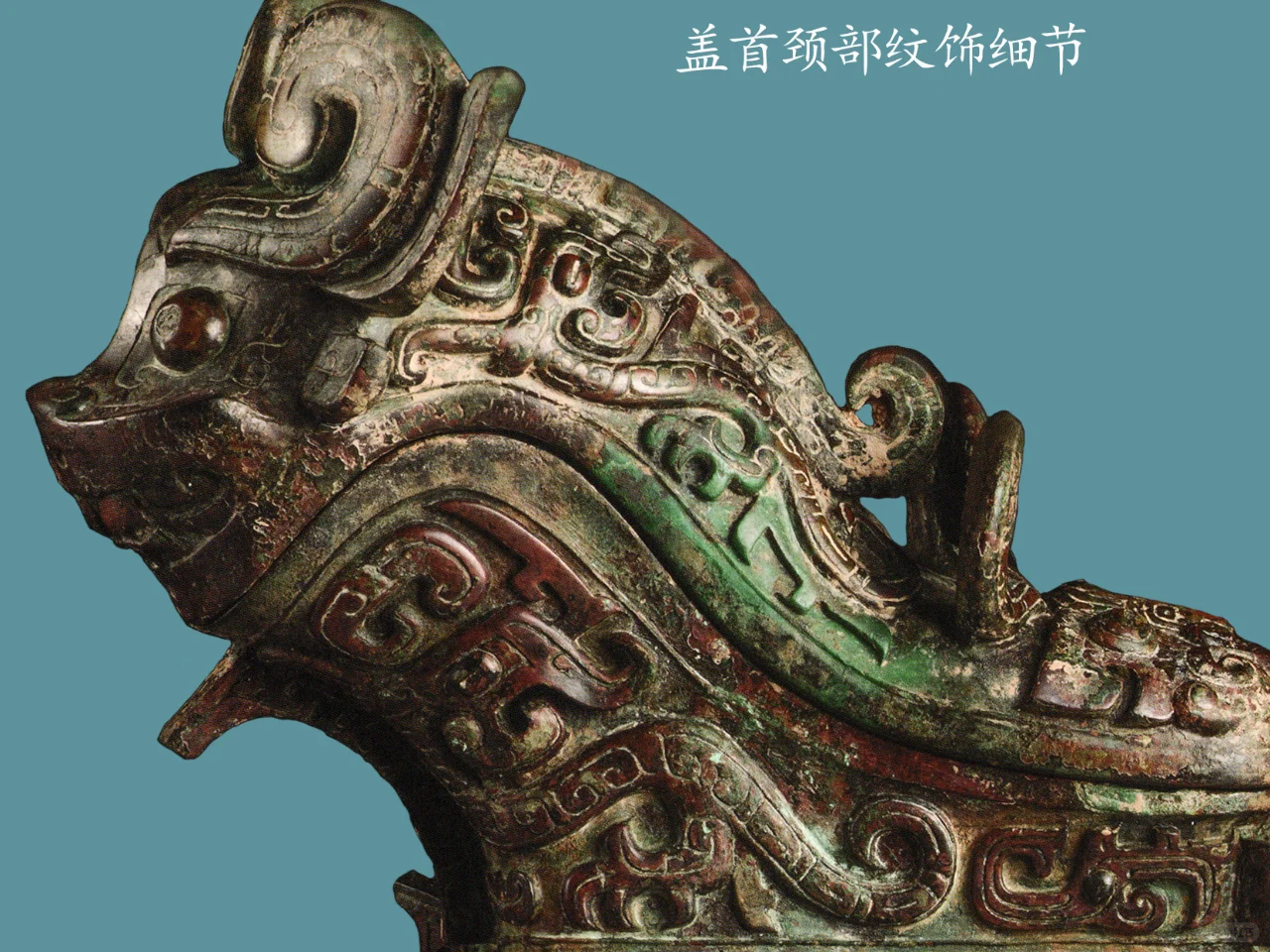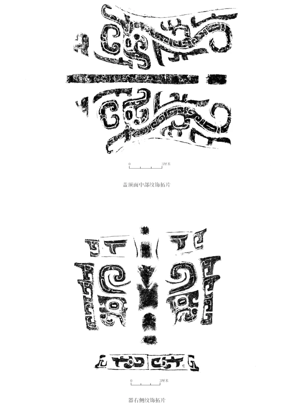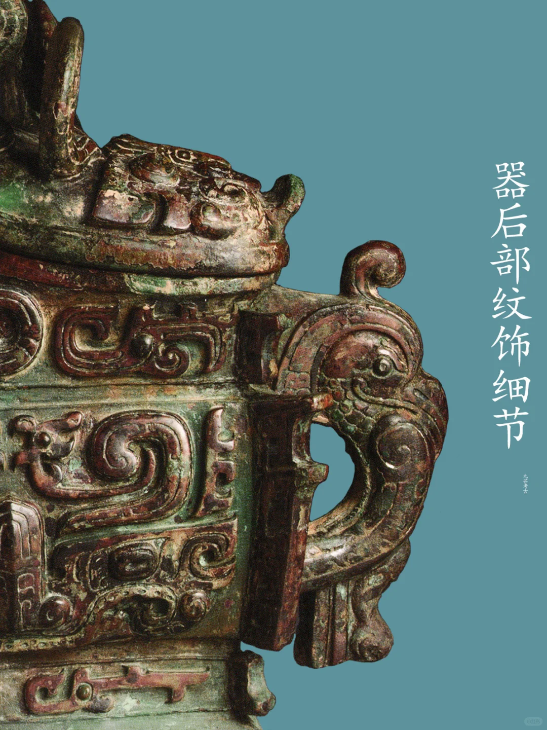 整器满花浮雕,立体感较强。盖首端为一兽首面,圆雕首角向上卷曲,上饰阴线纹;高鼻鼓目,两齿外露,两角之间铸一浅浮雕蛇首,从蛇首处开始,在盖脊正中延伸一条扉棱,饰为蛇身,直到盖身后部饰圆雕向上卷曲蛇尾:盖身饰二组大回首夔龙纹,以扉脊为界。盖尾部亦饰一兽面纹雕饰,圆雕兽角内卷曲,角面饰卷云纹,兽面圆面,叶形耳,粗眉圆目,嘴角内卷,鼻前端向前凸起。鼻面饰阴线刻蝉纹;盖尾部出圆雕兽尾示器盖部兽尾。颈部饰一大回首夔龙纹,扉棱后饰一象鼻夔纹,腹部前后两面各饰竖体夔龙纹,前部以扉棱为界,后部有鋬,以阴线刻蝉纹为界;器身两侧面各饰一组大兽面纹;圈足一周饰四组两两相对的象鼻夔纹纹,圈足侧面两组象鼻夔纹较长,前后面两组较短。