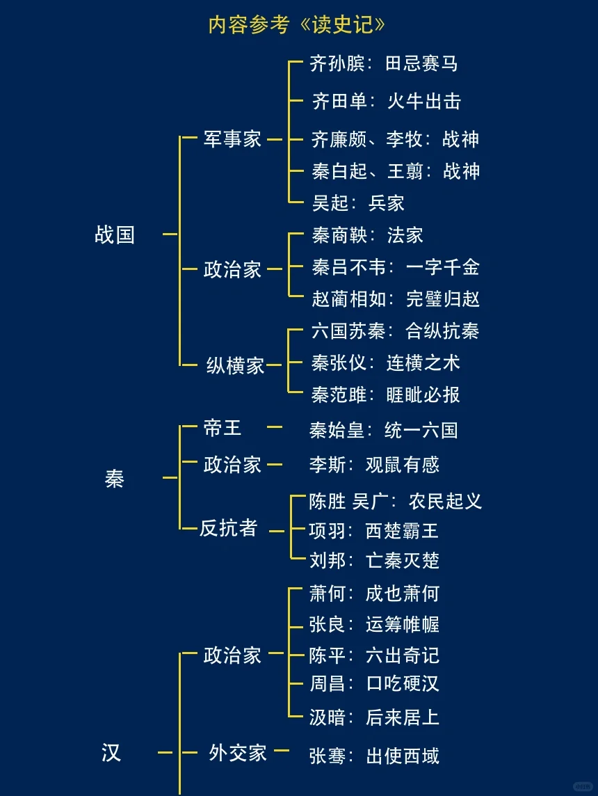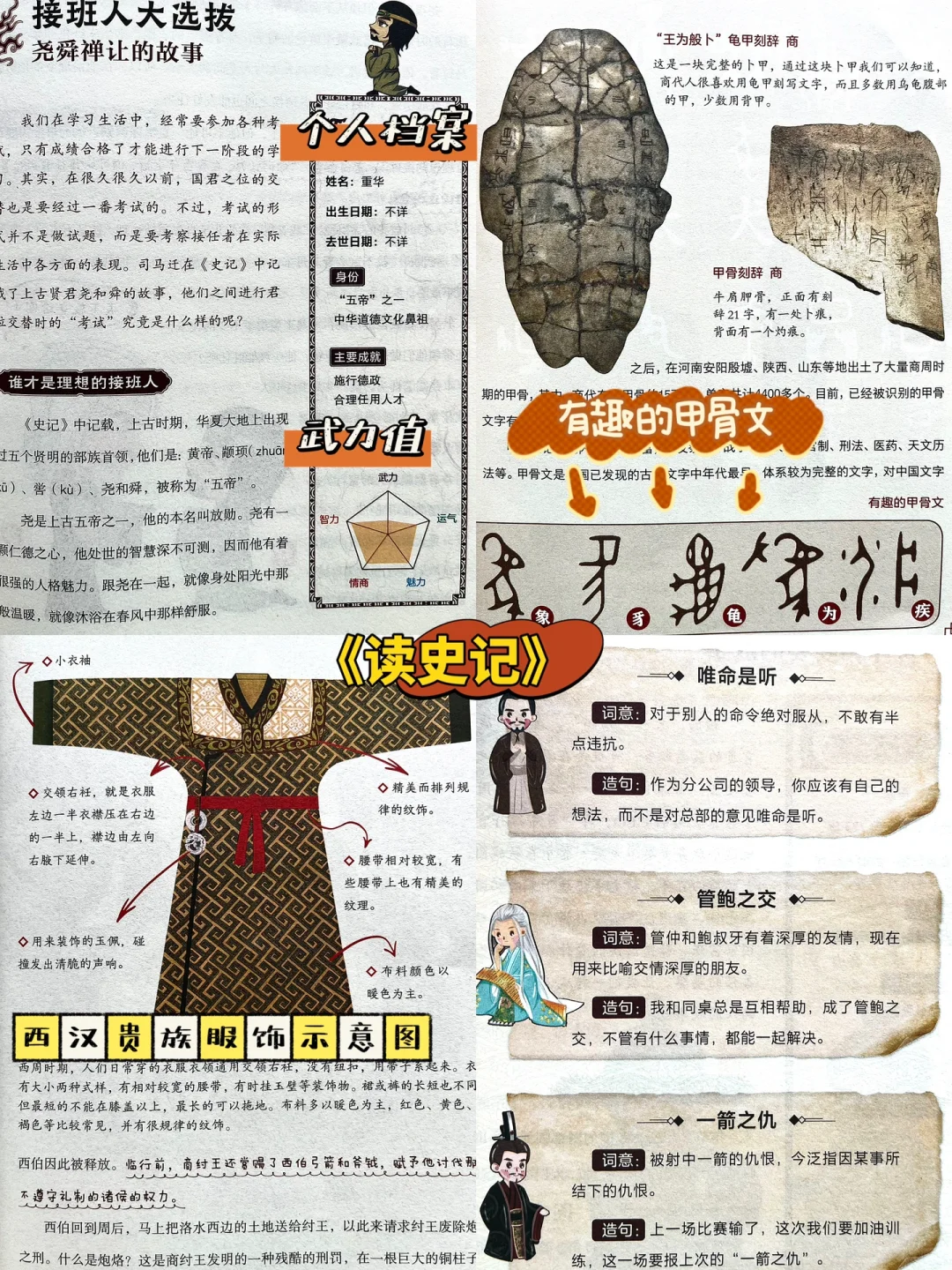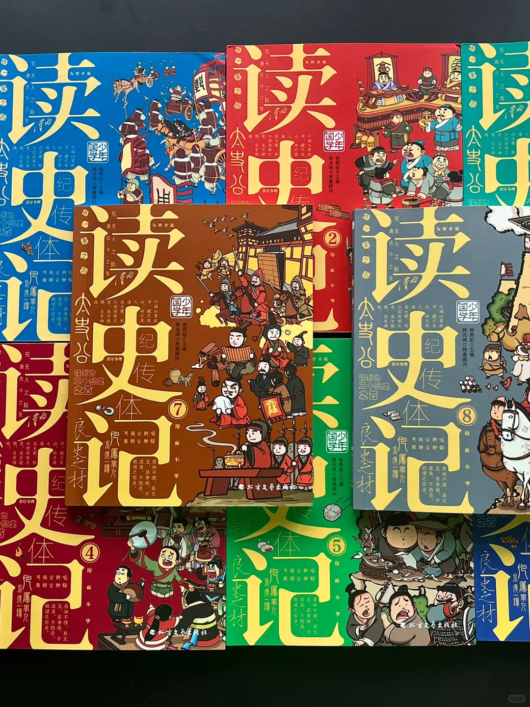 《史记》是中国第一部纪传体通使,想了解它,先要从基础信息入手。 🔹背景:汉朝建立,失散书典得以重整 🔹取材:《世本》《国语》《秦记》《楚汉春秋》等 🔹作者:司马迁子承父志,任太史令作史著。中间为兵败李陵辩护,遭遇宫刑,历经十四载,完成《史记》创作。 🔹内容:130篇,52万余字,分为 十二本纪:历代帝王政绩(五帝、夏、殷、周、秦、汉) 三十世家:各国诸侯兴衰 七十列传:重要人物事迹 十表:大事年表 八书:典章制度 📖虽然《史记》极具价值,但门槛很高,若想走进它,杨燕起老师主编的系列丛书《读史记》是一块不错的敲门砖。 📖它以漫画+故事形式,生动再现了100余位先贤事迹,并添加了文物介绍、成语典故等内容,有趣不失深度。 🔸《史记》内容从先秦开始。古有尧舜禅让、大禹治水,夏商则有桀、纣两大昏君,不过这都不是事儿,西周将迎来奴隶社会的鼎盛时期。 🔸到了东周,上半场春秋五霸齐桓公、晋文公、秦穆公、楚庄王、宋襄公轮番登场,其间出现了管鲍之交、卧薪藏胆、赵氏孤儿、伍子胥复仇、孔子创儒等精彩故事。 🔸下半场战国名将所向披靡,白起决战长平、王翦平定六国、廉颇负荆请罪,李牧大破匈奴。还有孙膑田忌赛马、田单火牛阵破燕等等。 🔸这一时期谋略家也很了得,张仪游说六国入秦、苏秦合纵六国抗秦、蔺相如设计完璧归赵,商鞅主张改革变法。同时,还出现了战国四公子、诗人屈原等名人。 🔸接下来是秦始皇的时代,他不仅统一中国,还统一了车轨、字体、货币和度量衡,称得上是千古一帝,但反抗声一直都在。 前有陈胜、吴广,后有项羽、刘邦。秦仅存二世被灭,而取代者则是汉朝建立者刘邦。 🔸西汉功臣的典故很多,萧何和韩信是“成也萧何败也萧何”,张良是“运筹帷幄之中,决胜千里之外”,陈平是“使平得宰天下,亦如此肉矣”,李广则是“桃李不言下自成蹊”。 🔸那时最大的敌人是匈奴,直至汉武帝时期,这一现象才得到改善,出使西域的张骞、七次出击的卫青、说出“匈奴未灭,何以家为”的霍去病都为此做出过杰出贡献。 🔸最后,司马迁还提及了西汉文学家,比如政论天下的贾谊、口吃文豪司马相如、大隐于朝东方朔,以及父授遗命的自己。 而以上这些故事,都经由《读史记》演绎再发光辉,令经典不再那么遥不可及了。