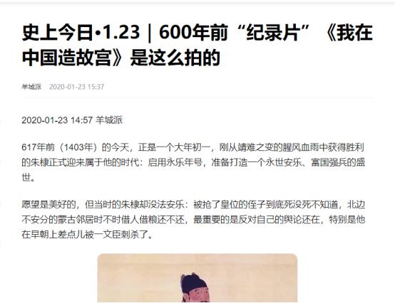 来源:羊城派《史上今日·1.23|600年前“纪录片”《我在中国造故宫》是这么拍的》-2020-01-23