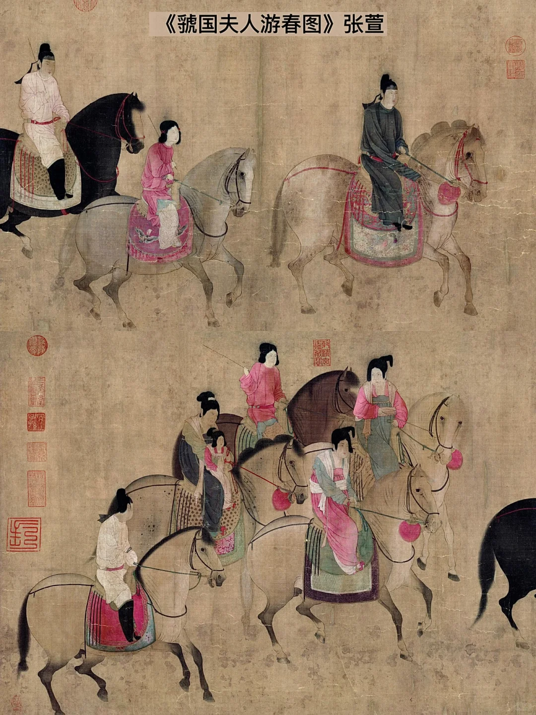 ✨张萱的《虢国夫人游春图》便通过杨玉环的三姐花团锦簇、前呼后拥的气派展现出她们奢华生活背后,王朝腐烂的一角。