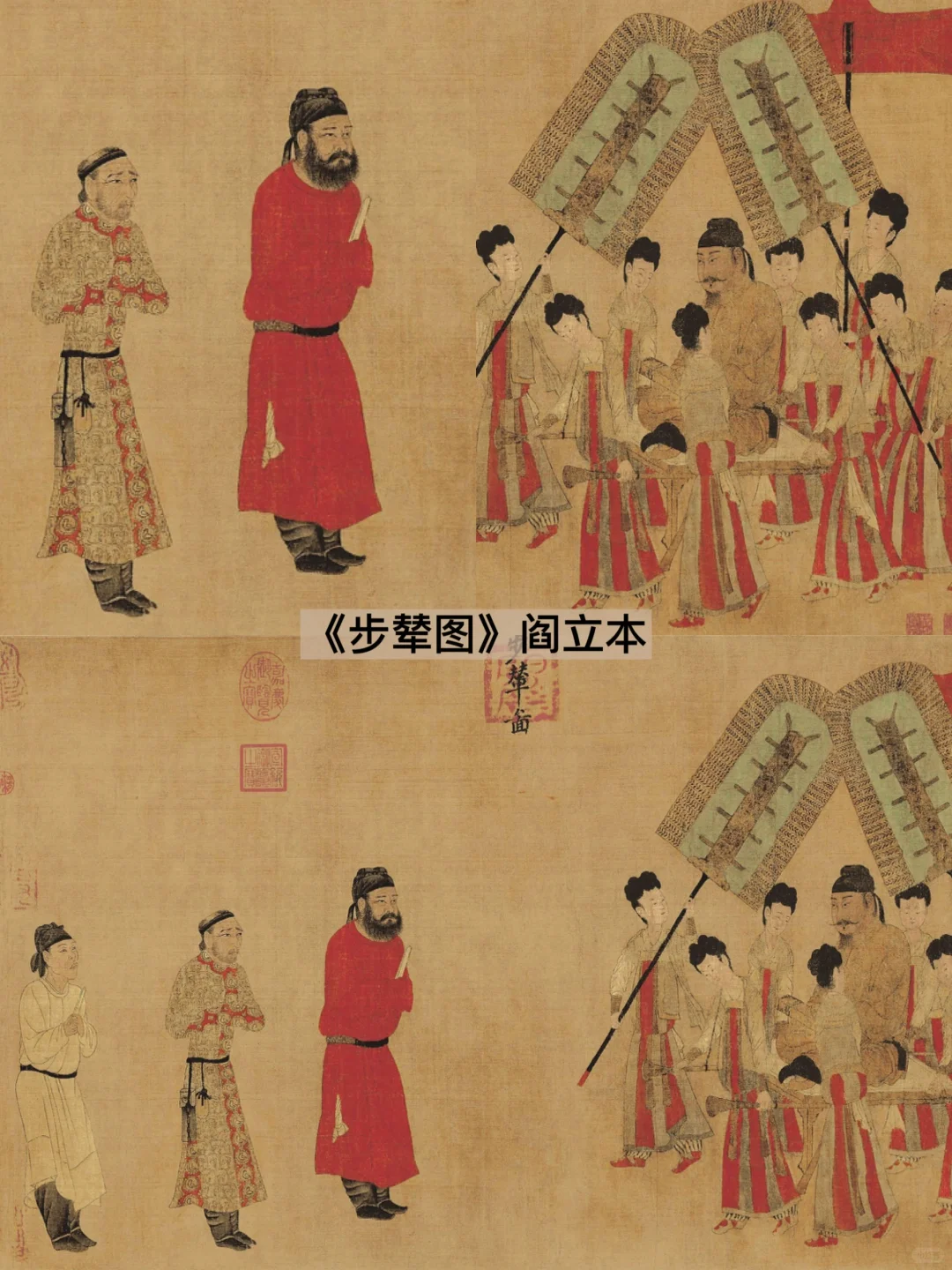 首先我们要看的是✨《步辇图》,其画作者阎立本为当朝宰相兼画师,他再现了吐蕃王松赞干布派使者向唐太宗提亲的场面。