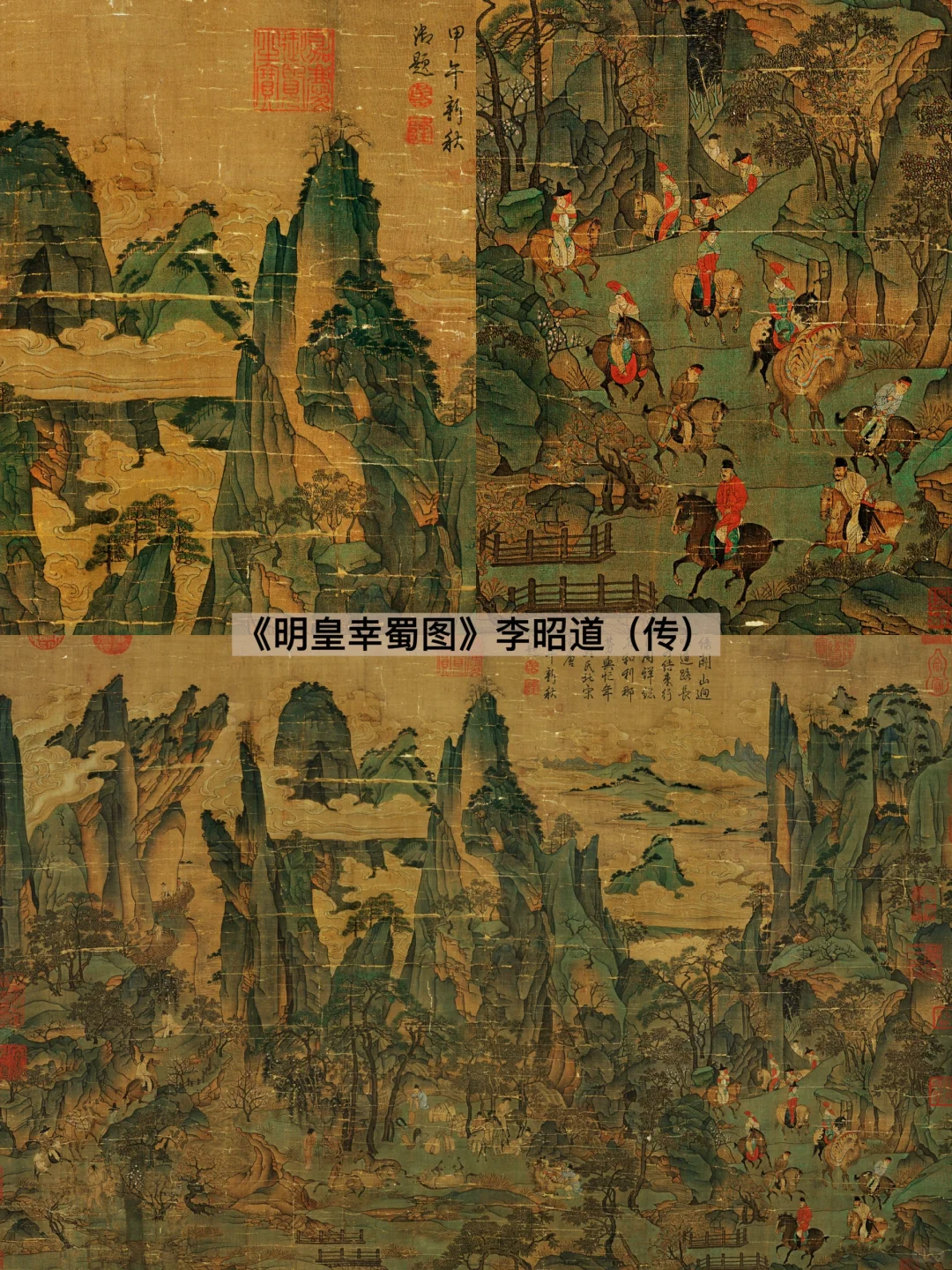 756年6月,安禄山攻陷潼关,唐玄宗逃难入蜀,一路艰难险阻、人心叵测、萧条异常,而这场面,被✨李昭道的《明皇幸蜀图》,巧妙转化成闲暇惬意的春游之景。