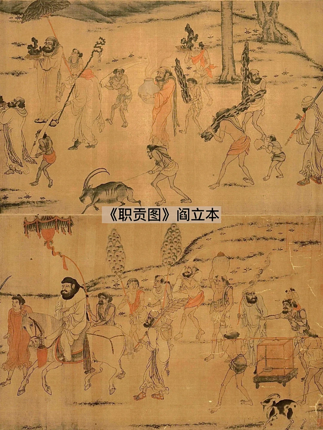 于是乎,✨阎立本的《职贡图》呈现出这样一幅画面:婆利国(文莱)和罗刹国(俄罗斯)的使臣骑马带队,身后侍从手捧珊瑚、象牙、美酒等奇珍异宝,奔赴向长安朝贡的路上,这是贸易交流,也是臣服信号。