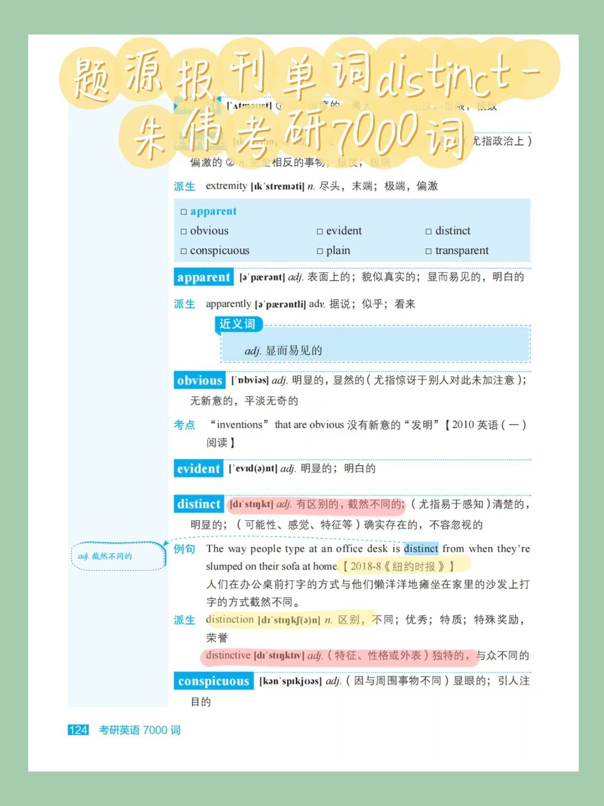 🌱派生词时间:distinction表示“区别,不同;优秀;特质;特殊奖励,荣誉”,而distinctive则表示“(特征、性格或外表)独特的,与众不同的”。
