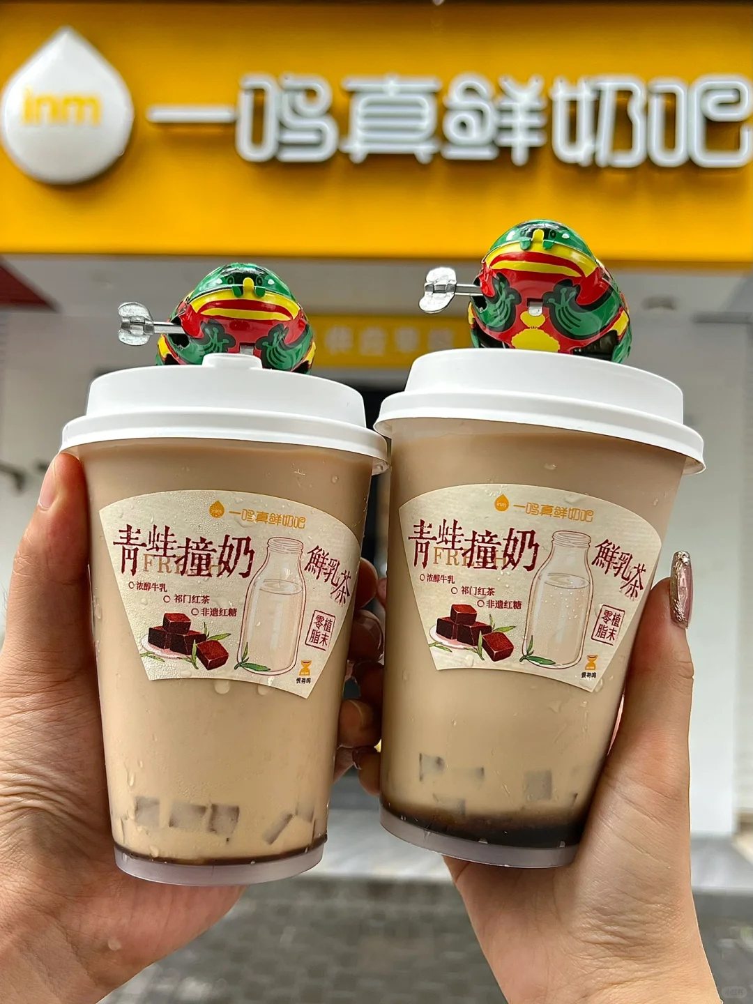 我要为一鸣扛大旗!!!! 居然上架了我的童年回忆🐸青蛙撞奶!!! 我真的暴风哭泣😢小时候的回忆在向我招手👋 🐸一鸣青蛙撞奶 一口下去你能感受到的童年味道!!! 配料表hin干净!0⃣️植脂末!好喝不月半! 香浓丝滑的牛乳➕非遗红糖➕红茶萃液➕QQ的椰果颗粒!好喝又有嚼劲! 不愧是我们江浙沪的骄傲!我的心愿是一鸣能开遍全国!让全国人民都能喝到他!!!