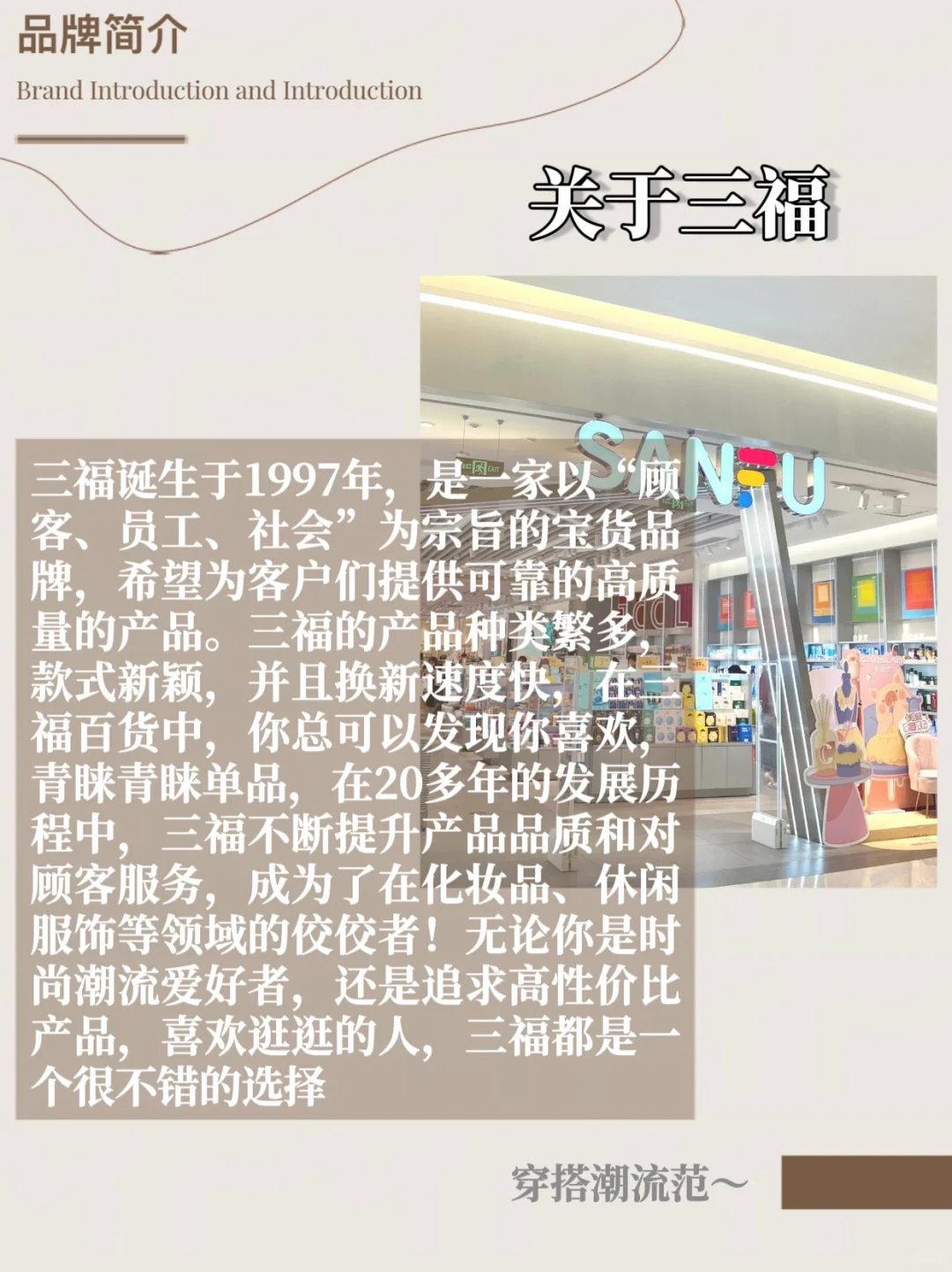三福诞生于1997年,是一家以“顾客、员工、社会”为宗旨的宝货品牌,希望为客户们提供可靠的高质量的产品。三福的产品种类繁多,款式新颖,并且换新速度快,在三福百货中,你总可以发现你喜欢,青睐青睐单品,在20多年的发展历程中,三福不断提升产品品质和对顾客服务,成为了在化妆品、休闲服饰等领域的佼佼者!无论你是时尚潮流爱好者,还是追求高性价比产品,喜欢逛逛的人,三福都是一个很不错的选择