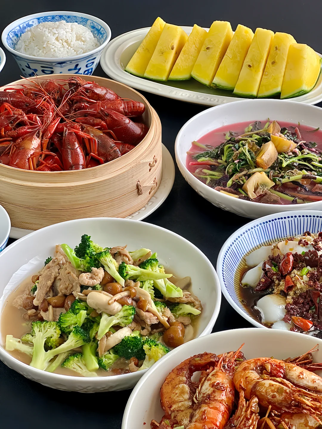 今日菜单: 1️⃣蒜蓉罗氏虾 2️⃣椒麻鱼片 3️⃣皮蛋烧苋菜 4️⃣菌菇肉丝炒西兰花 5️⃣清蒸小龙虾 6️⃣黄西瓜 🌈做法都写在图片上啦,往左滑看教程⬅️