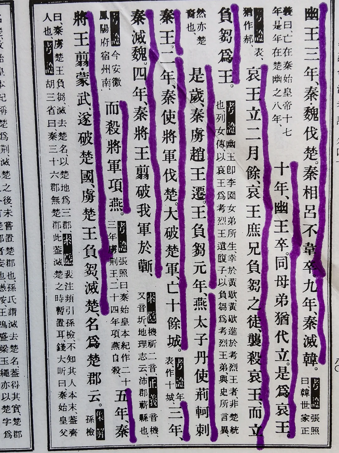 秦楚结盟三百余年,两国关系错综复杂,来看看《楚世家》晚期的记载,一窥全豹。 图二、三,《史记 楚世家》: 考烈王元年,纳州于秦以平,是时楚益弱。 六年,秦围邯郸,赵告急楚,楚遣将军景阳救赵。 七年,至新中,秦兵去。 十二年,秦昭王卒,楚王使春申君吊祠于秦。 十六年,秦庄襄王卒,秦王赵政立。 二十二年,与诸侯共伐秦,不利而去。楚东徙都寿春,命曰郢。 二十五年,考烈王卒,子幽王悍立。李园杀春申君。 幽王三年,秦、魏伐楚。秦相吕不韦卒。 九年,秦灭韩。 十年,幽王卒,同母弟犹代立,是为哀王。哀王立二月余,哀王庶兄负刍之徒袭杀哀王而立负刍为王。 是岁,秦虏赵王迁。 王负刍元年,燕太子丹使荆轲刺秦王。 二年,秦使将军伐楚,大破楚军,亡十余城。 三年,秦灭魏。 四年,秦将王翦破我军于蕲,而杀将军项燕。 五年,秦将王翦、蒙武遂破楚国,虏楚王负刍。
