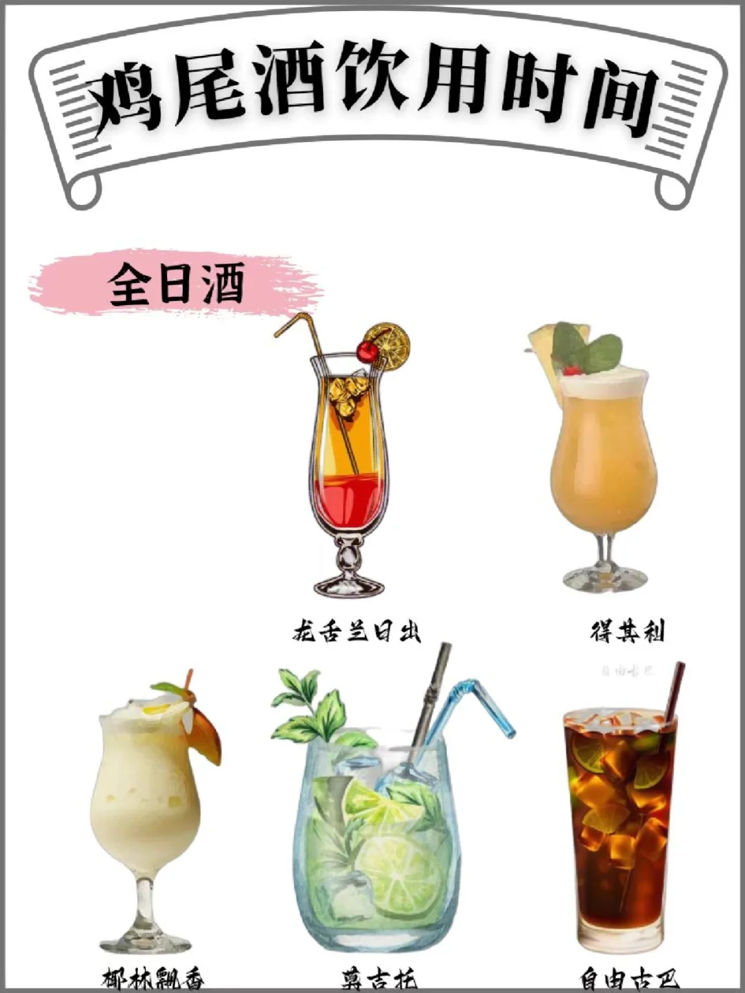 🍸全日酒跟餐前餐后没有关系,是什么时间都可以引用的酒。如:自由古巴、得其利、莫吉托、椰林飘香、龙舌兰日出。