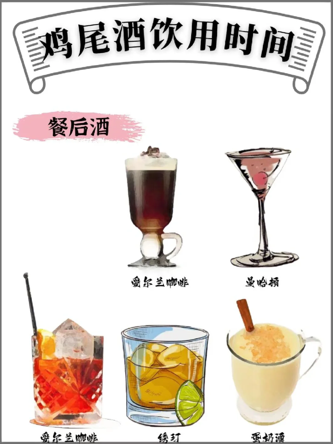 🍸餐后酒即餐后引用,可以遮盖口腔的味道,也能促进消化。以甜口味道浓厚的酒款为主。如:蛋奶酒、绣钉、曼哈顿、爱尔兰咖啡、教父