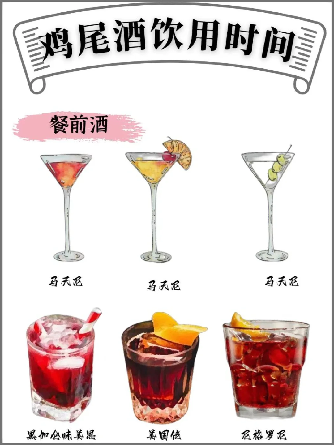 🍸餐前酒即餐前饮用,用来滋润喉咙、增进食欲,一般辣口酒款较多。如:马天尼、尼格罗尼、美国佬、黑加仑味美思;