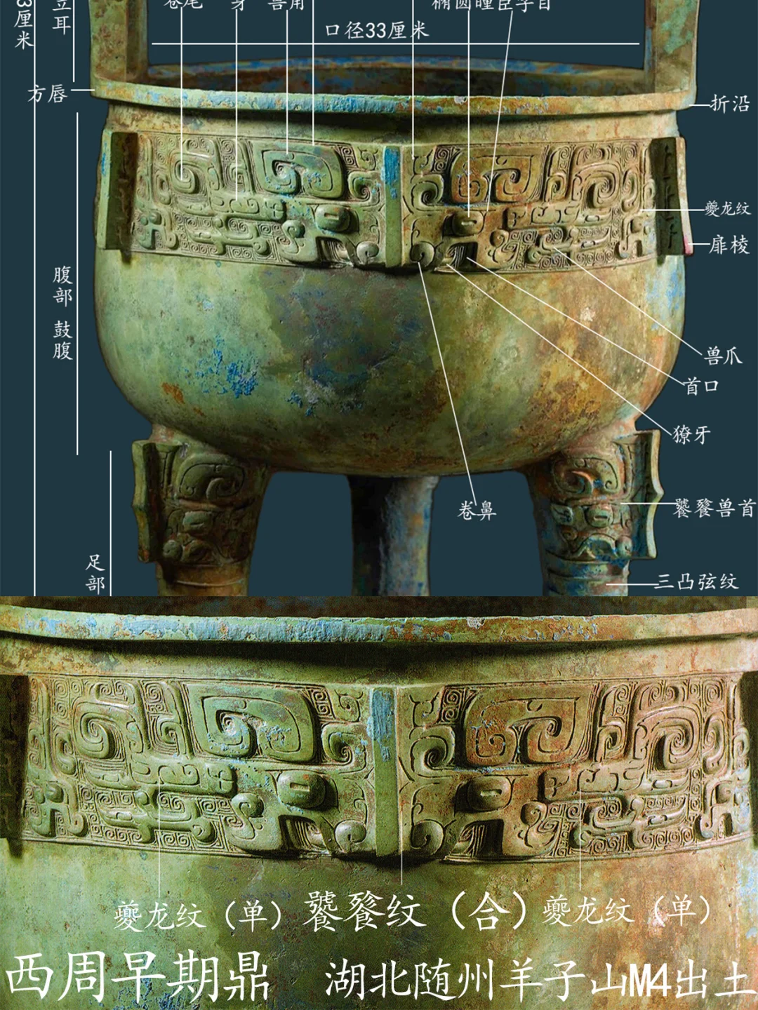 图八、西周早期饕餮纹圆鼎,非常明显,早期夔龙纹前还未添加象鼻纹,两夔龙纹组合而成饕餮纹。