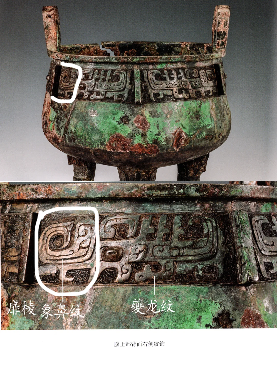 图七、象鼻夔龙纹圆鼎纹饰细部对比、拆解,可以看出,是明显的在原夔龙纹前新添加的象鼻纹,如不添加象鼻纹,两条夔龙纹+扉棱就是标准的饕餮纹。
