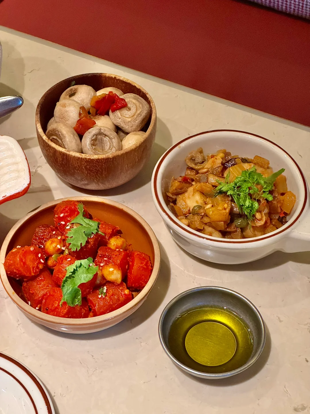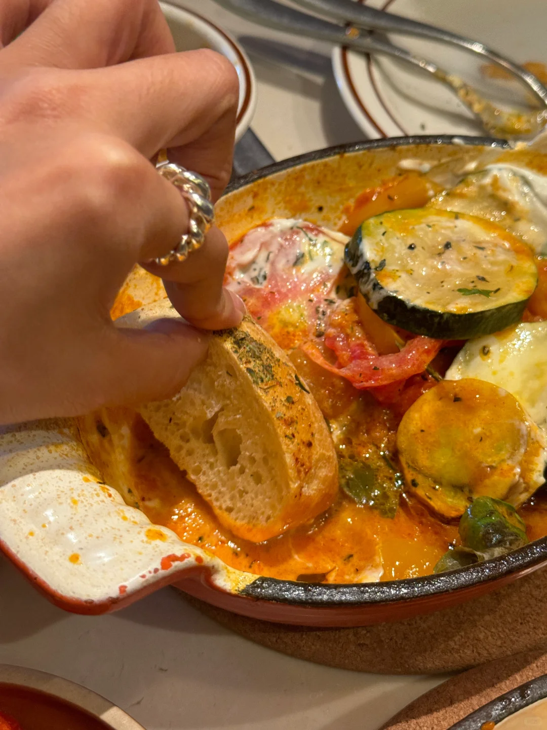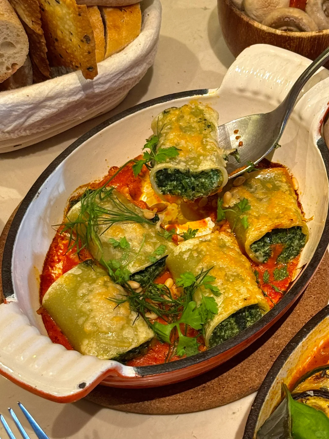 很好吃!奶酪➕菠菜➕番茄!奶酪竟然吃出肉香🤤 普罗旺斯烤蔬菜的酱汁也很好吃!蘸面包太绝啦!!