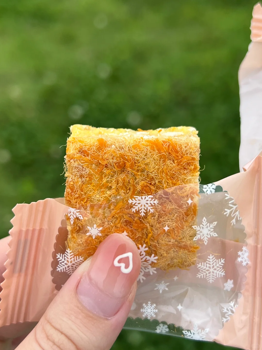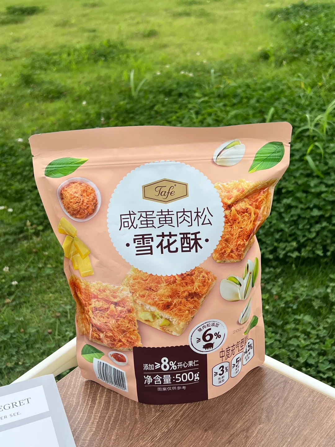 雪花酥真的好好吃,再加上我喜欢的咸蛋黄肉松,口感绝了,酥酥软软!里面还有开心果颗粒,一口咬下去,奶香醇厚!