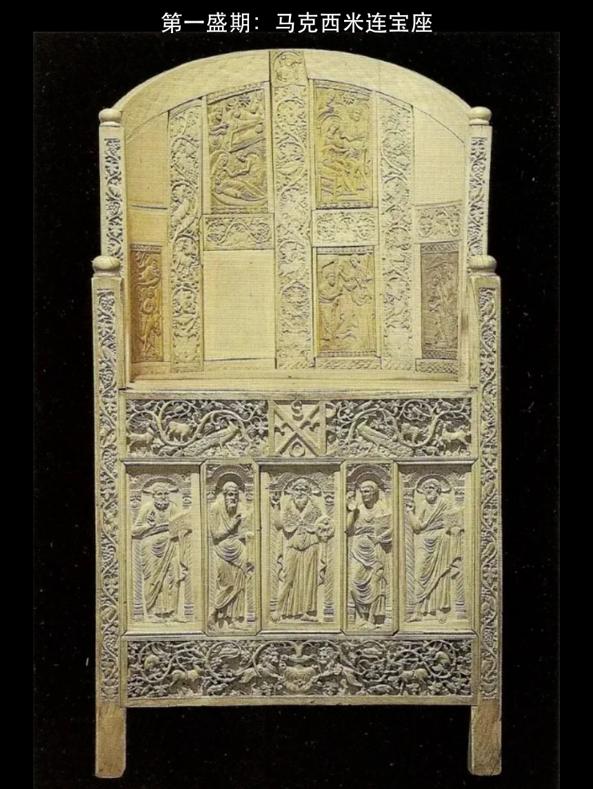 -此时的建筑以砖石结构为主、拱形窗户增多;马赛克画讲究对称、几何和秩序,小型马赛克画开始出现;手抄本中的人物更加瘦长变形,雕塑同样如此,艺术进入程式化发展;金银加以宝石、珐琅装饰,体现出工匠的超高水准。