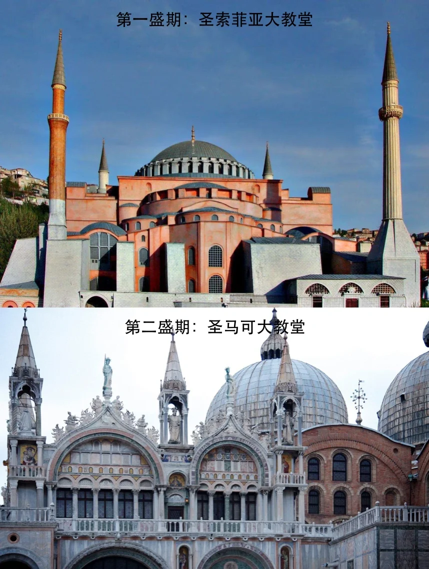 -13世纪,十字军东征后,奥洛加斯时期拜占庭艺术再度复兴,进入第三盛期。建筑以希腊十字式为主,工艺水平更加卓越、人物绘画也有了个性,但帝国颓势不可逆转,15世纪,君士坦丁堡被土耳其人攻占,信仰变更让拜占庭艺术遭到毁灭性破坏。