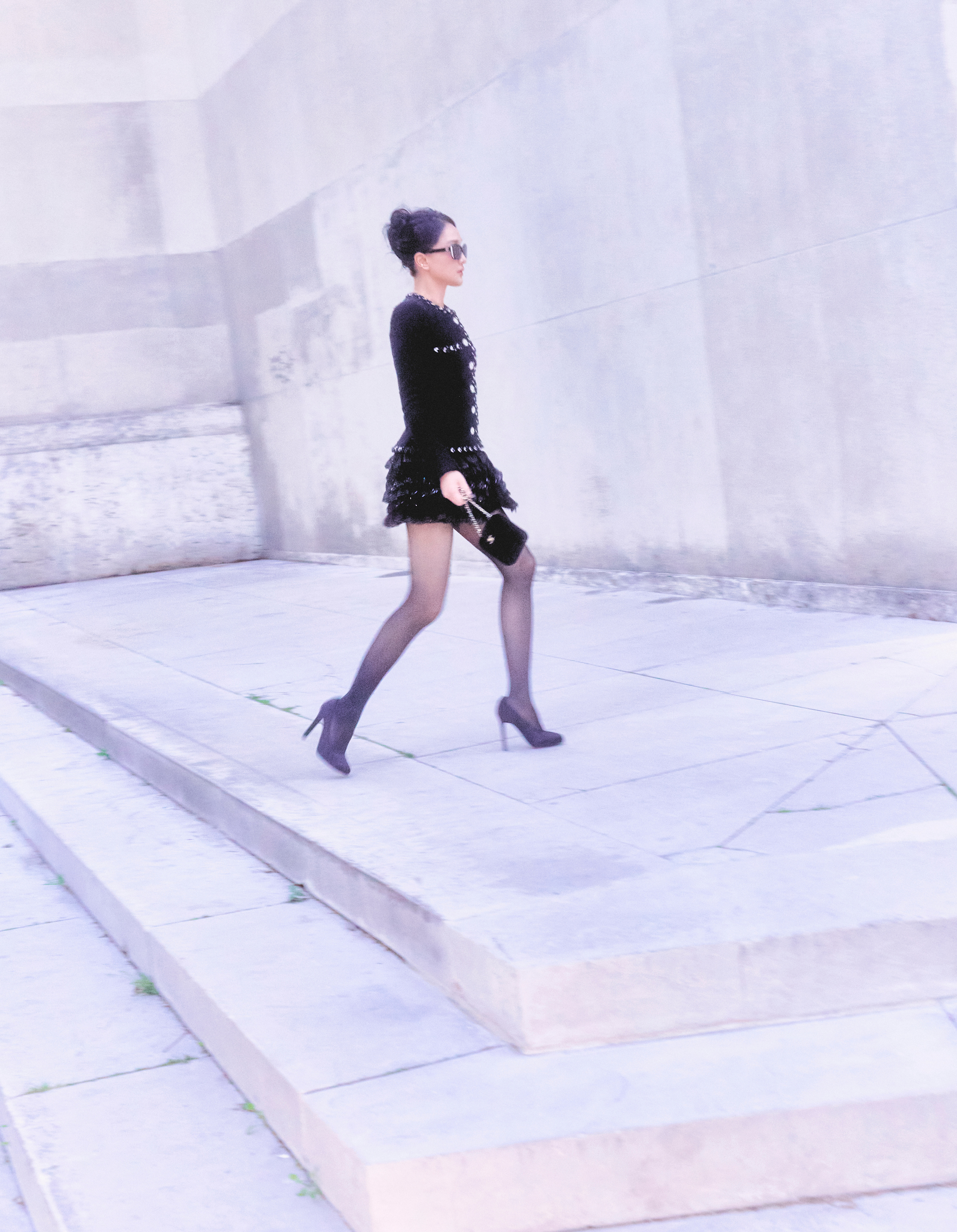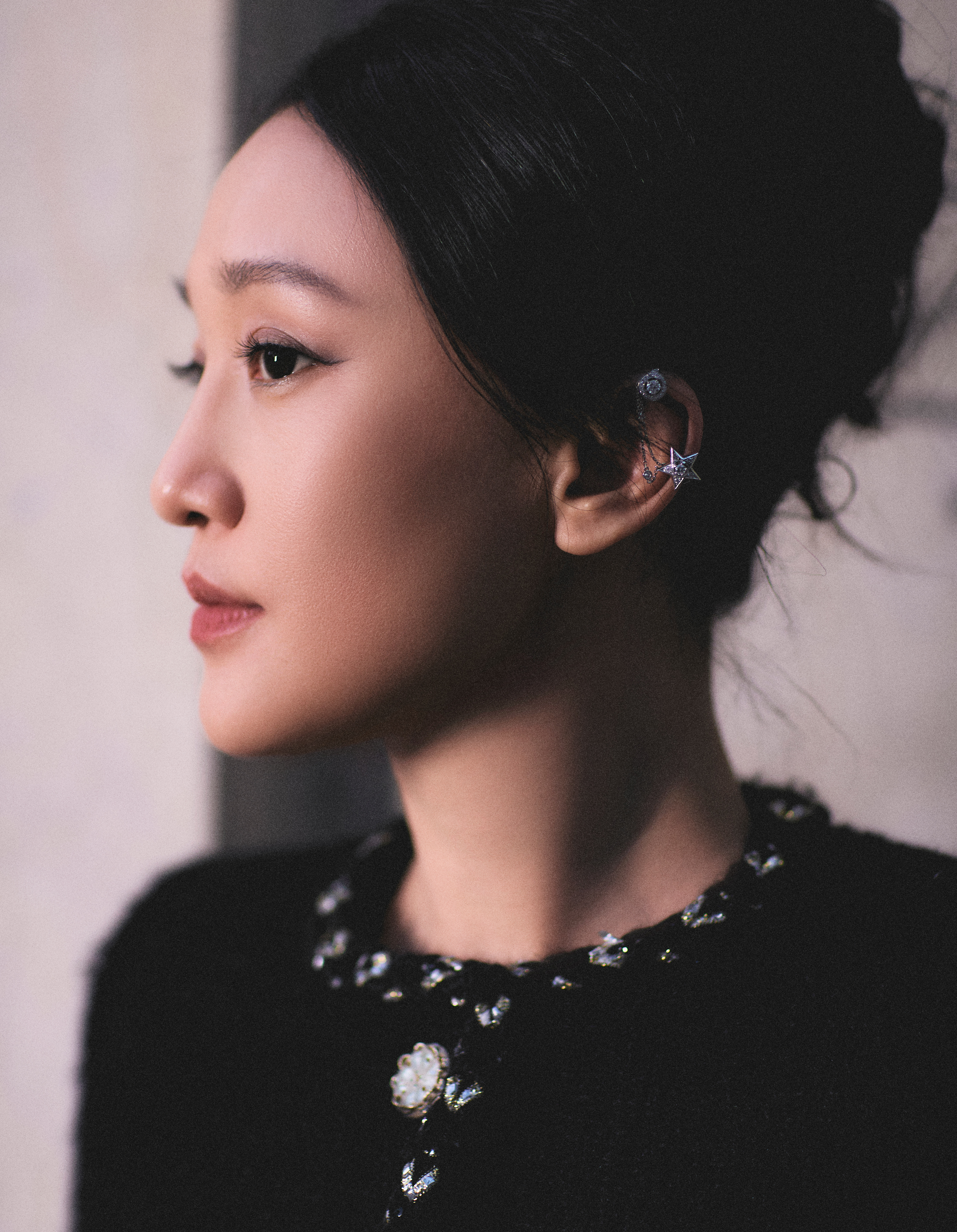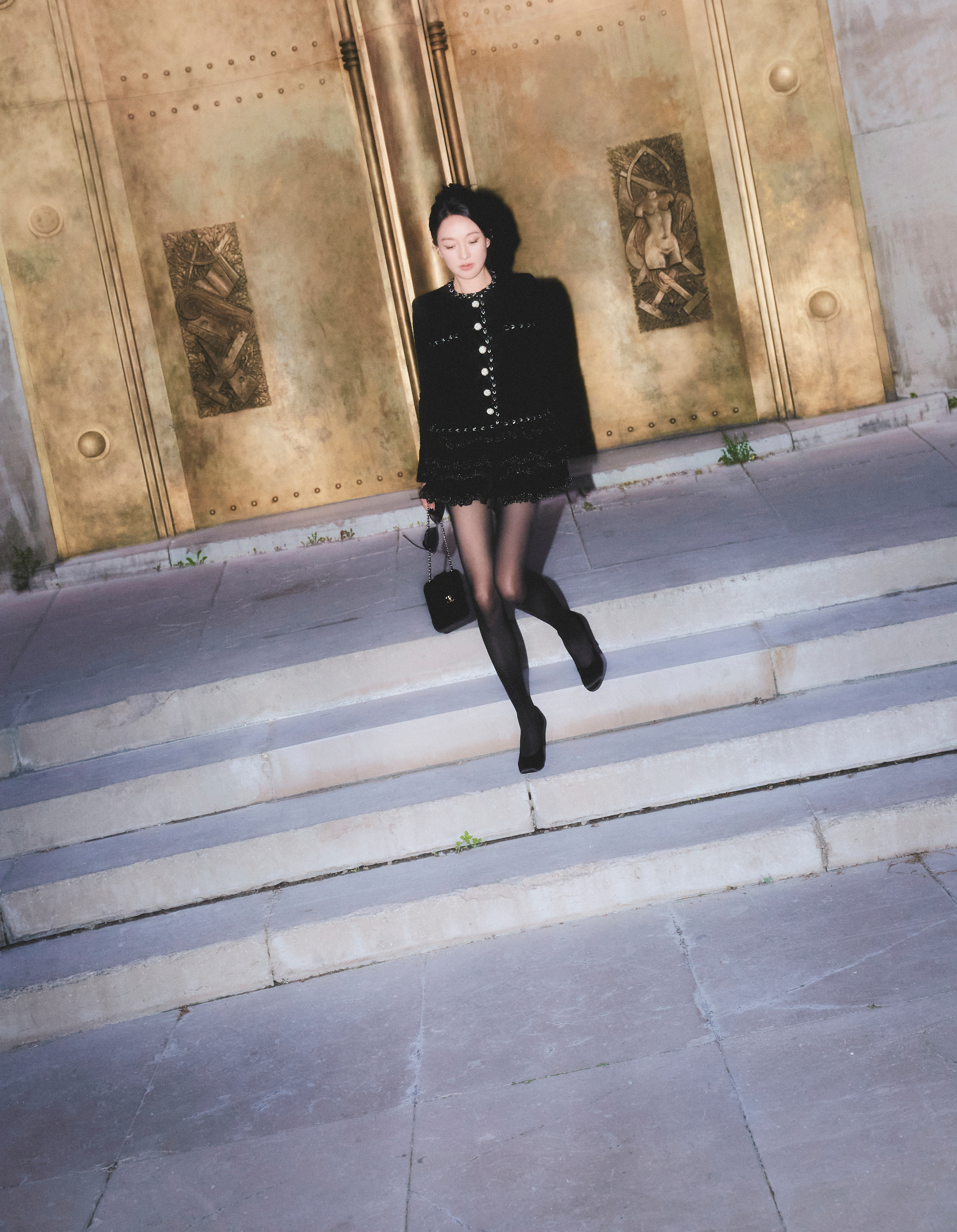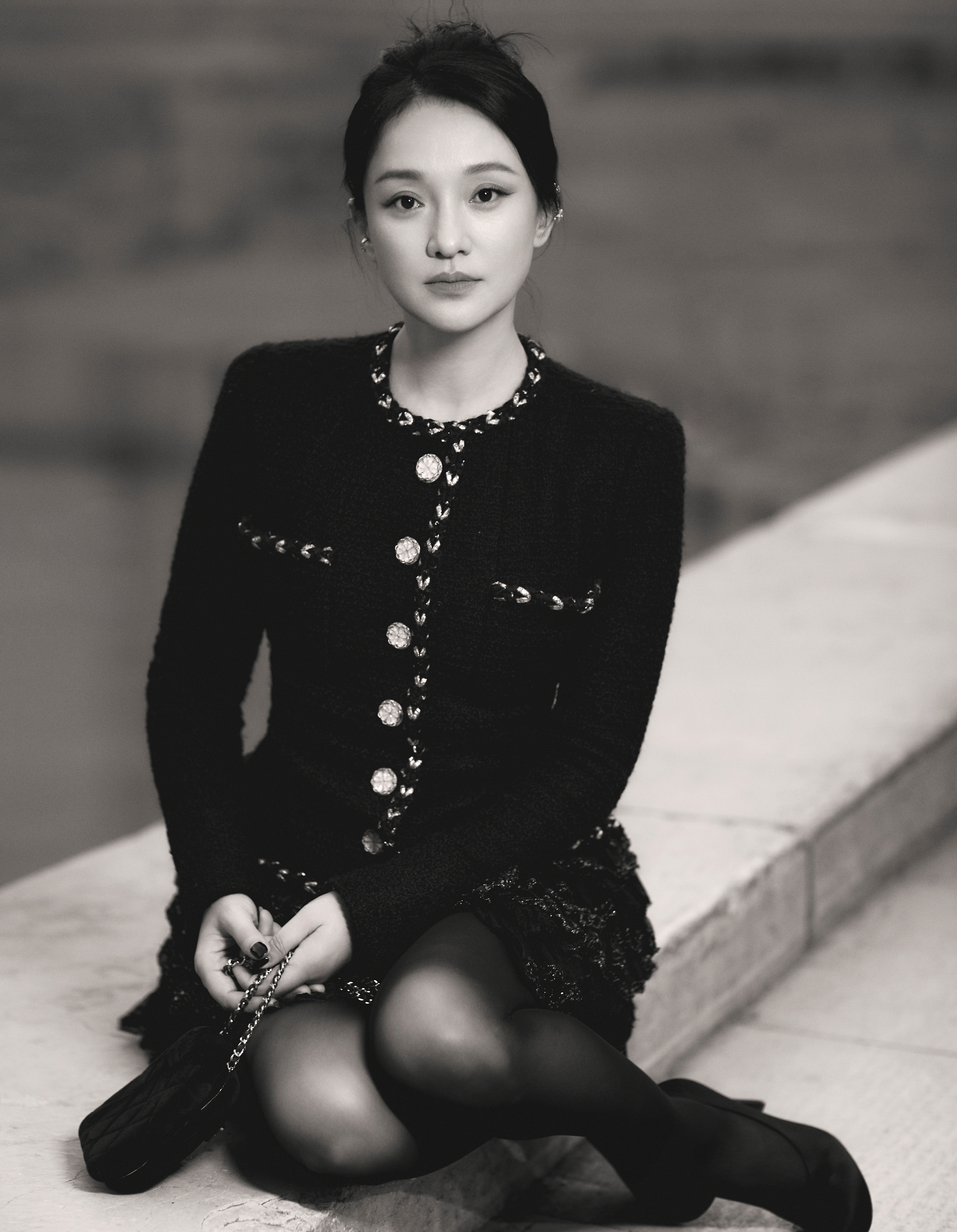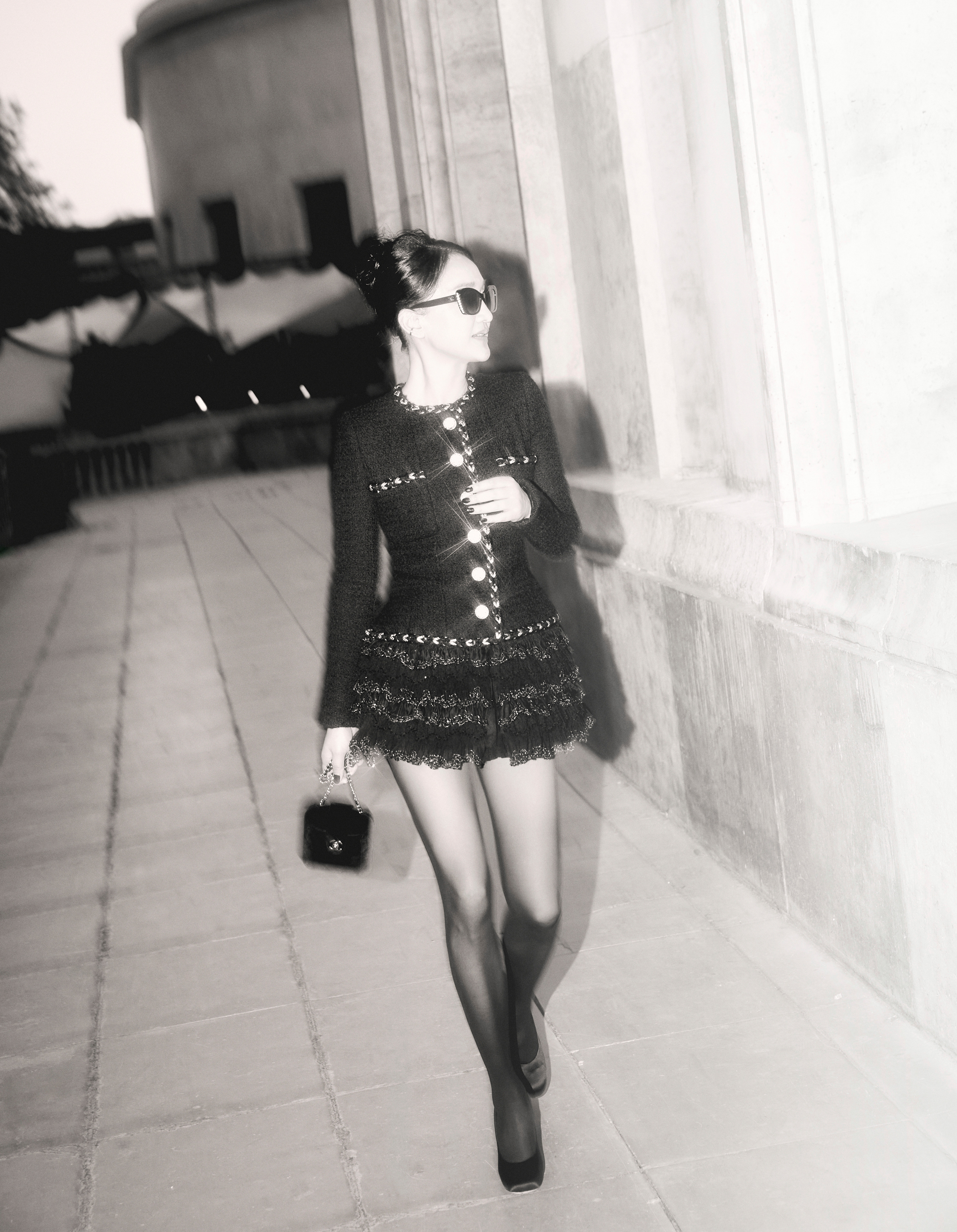 #周迅 香家长公主# 周迅今日亮相巴黎高定秀,单排扣斜纹呢外套、链条小方包搭配黑