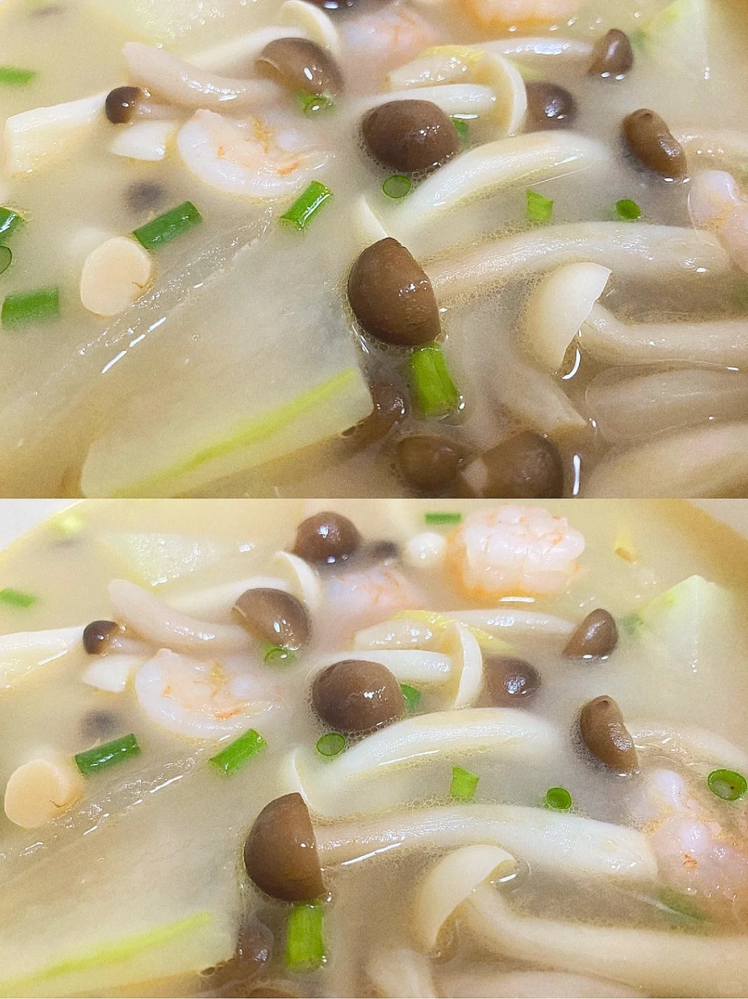 不愧是鲜虾快手汤! 也太太太鲜甜了吧😭 还可以当减肥餐,减肥都是快乐的吧! ✅材料 白玉菇,蟹味菇各100g,虾仁100g,冬瓜半圈 (两人份,一人喝可以材料全部减半) ✅步骤 1️⃣菌菇焯水洗净备用 2️⃣下油爆香葱白,姜丝,再下全部材料翻炒 3️⃣加适量开水炖煮十分钟 4️⃣最后放盐,胡椒粉,葱就可以啦~ 简单快手低脂汤,快快喝起来~