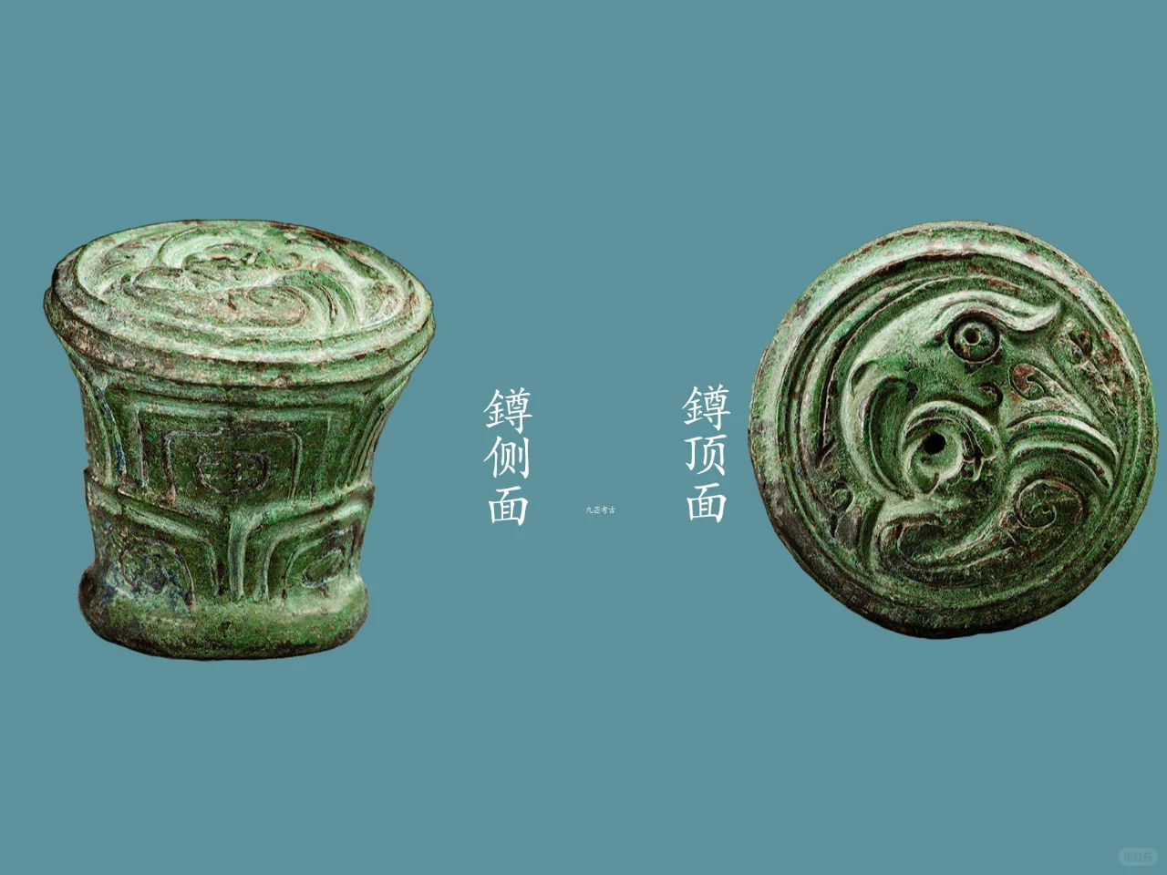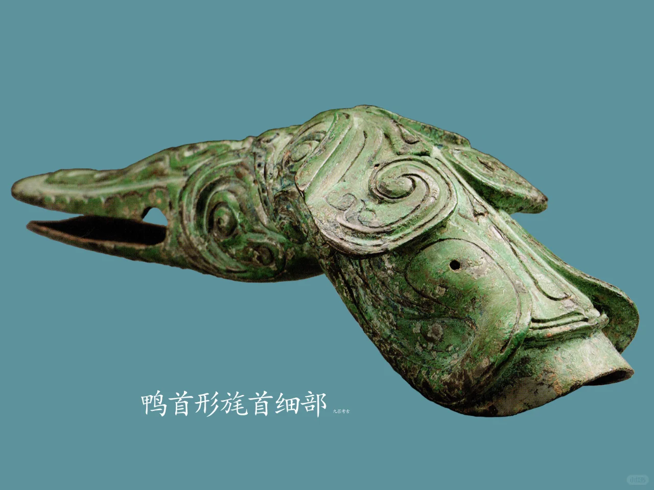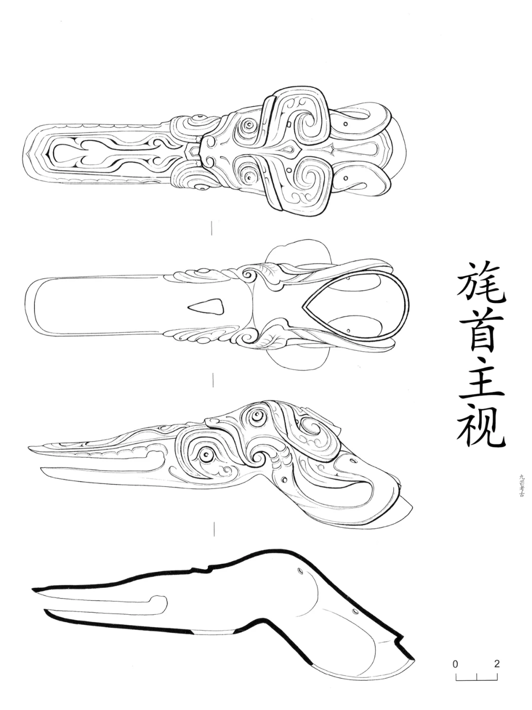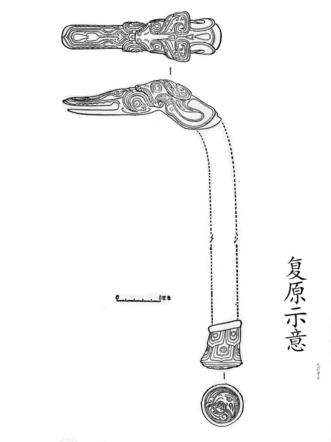 旄首鸭首形,分上下两部分,上部兽首咬合下部兽首,上部兽首,圆目、横眉,卷角耸起,兽角下侧饰回卷长兽身,身面上部饰鳞纹。下部鸭形兽首,两小圆目,横眉,鸭嘴微启,上喙饰纹饰,下喙有透空的三角形穿孔。鐏体饰一周垂鳞纹,鐏顶面饰团身凤鸟纹,凤鸟卷曲团身,尖喙,圆目,利爪。出土位置及木柲痕迹: