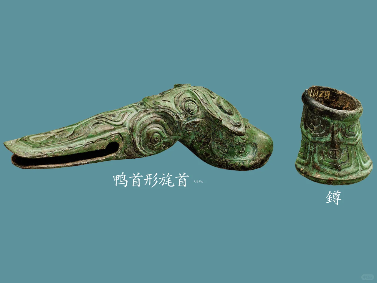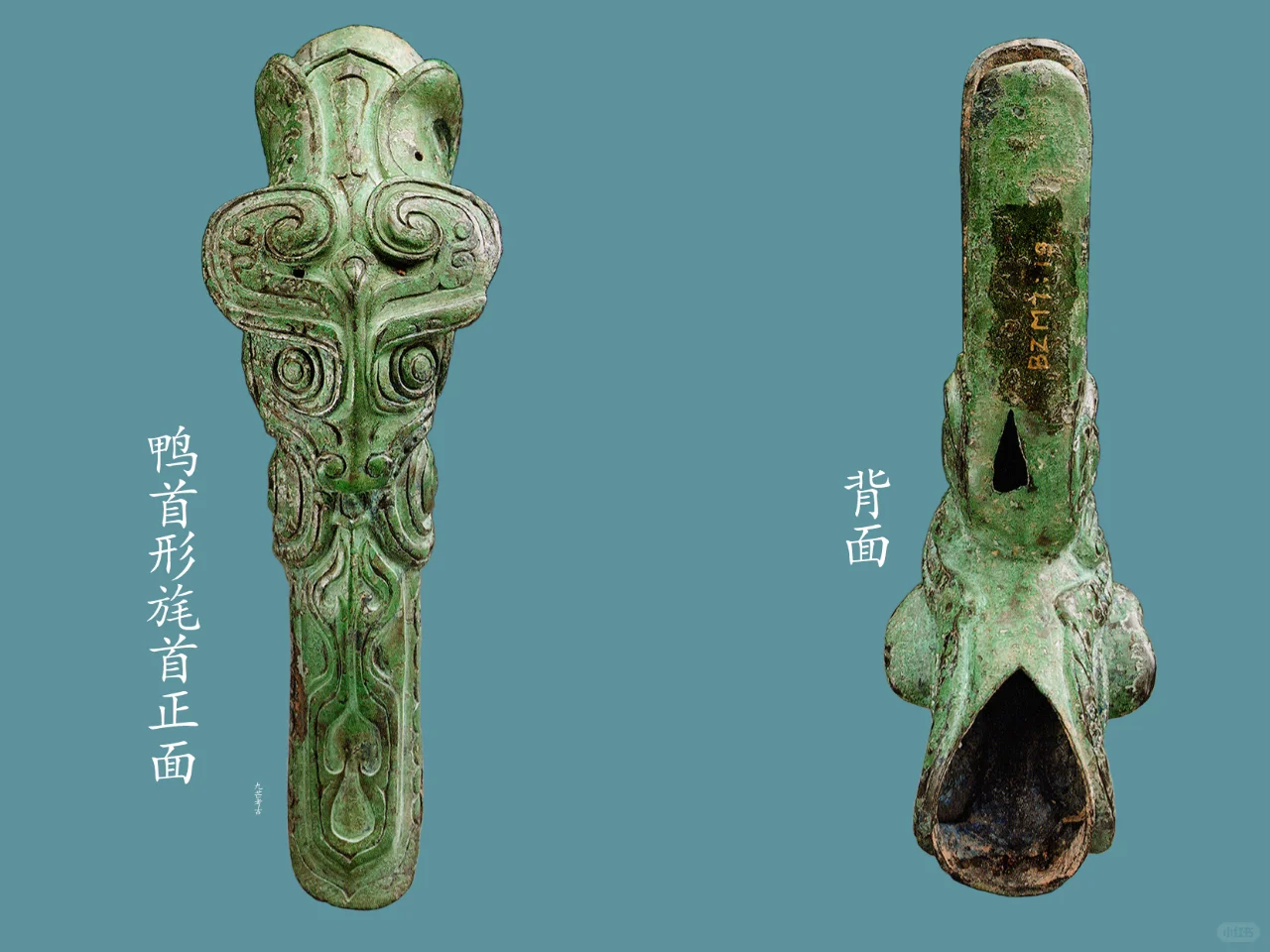 鸭首形旄首通长18.3厘米,鐏(zun)高5.7厘米,銎口径3.4*5.1厘米,重(旄首)278克,鐏144克。