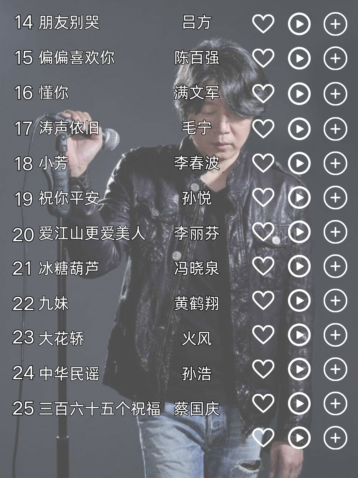 上海滩 叶丽仪 千千阕歌 陈慧娴 漫步人生路 邓丽君 铁血丹心 罗文、甄妮 沧海一声笑 许冠杰 男儿当自强 林子祥 万里长城永不倒 叶振棠 鲁冰花 甄妮 一剪梅 费玉清 外婆的澎湖湾 潘安邦 同桌的你 老狼 再回首 姜育恒 花心 周华健 朋友别哭 吕方 偏偏喜欢你 陈百强 懂你 满文军 涛声依旧 毛宁 小芳 李春波 祝你平安 孙悦 爱江山更爱美人 李丽芬 冰糖葫芦 冯晓泉 九妹 黄鹤翔 大花轿 火风 中华民谣 孙浩 三百六十五个祝福 蔡国庆