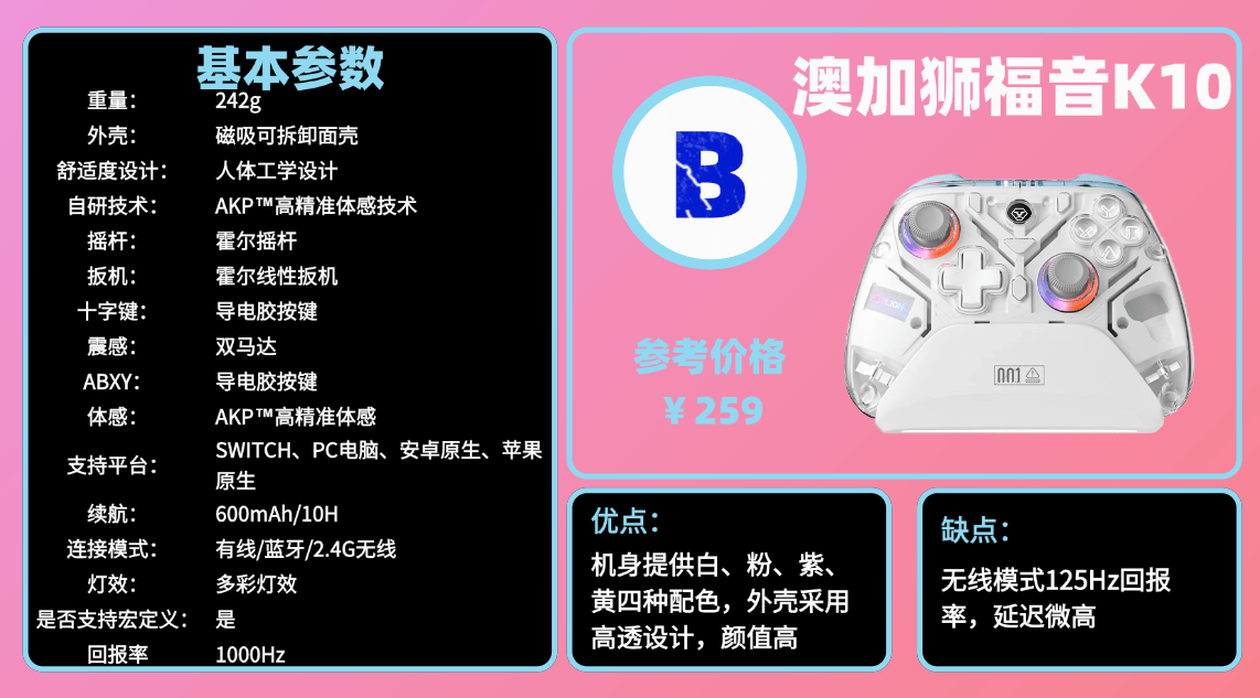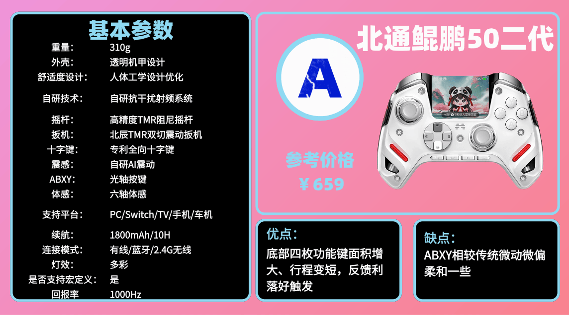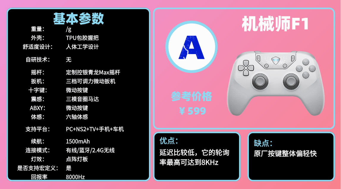 功能层面也比较“堆料”,支持三模连接,兼容手机、PC与Switch,六轴陀螺仪体感瞄准、非对称震动、宏编程按键以及KeyLinker软件调节,都能满足进阶玩家折腾需求。摇杆帽还能切换高低规格,更适合赛车、飞行类需要细腻微操的场景。不过RGB灯效亮度偏高,长时间夜间游玩有时会有点分神;而宏键放在底部虽然保持了正面观感,但盲操作需要一点熟悉时间。