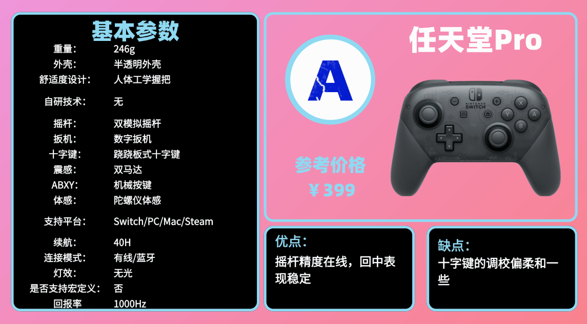 平台体验方面,作为官方产品,它在Switch上的适配可以说是无缝级别,配对与回连速度快,稳定性和延迟表现都非常可靠。除了Switch外,它也支持通过蓝牙连接PC或Mac,Steam能直接识别,基本无需额外设置即可开玩。续航表现同样稳健,单次可使用约40小时,对于经常长时间游戏的玩家来说相当安心。