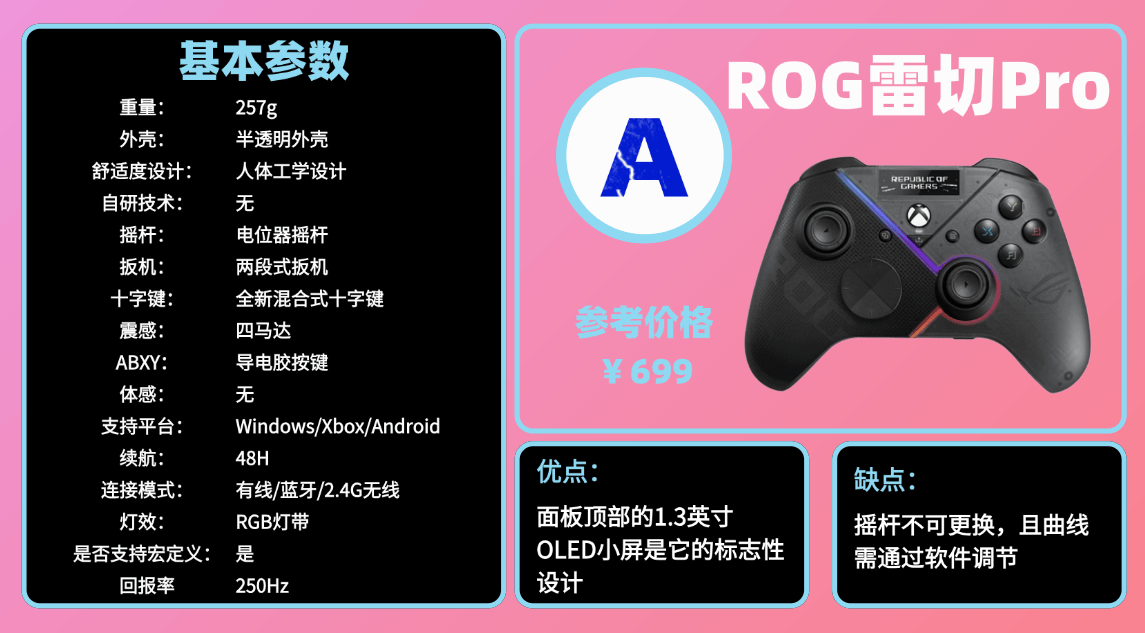 核心亮点:这款手柄整体走的是偏硬核的电竞机械风,但并没有一味地堆灯效,而是更多把心思放在结构设计和触感细节上。半透明拼接外壳配合斜切线条,再加上标志性的ROG元素纹理,让它既有机甲感又不失高级感,257g左右的重量拿在手里比较轻松,重心分布也比较合理,长时间操控不容易累。顶部那块1.3英寸OLED屏幕是整机的“灵魂”,不仅能显示连接状态、电量、档位,还能加载自定义动画,功能和玩味性兼具。非对称摇杆阻尼手感适中,回正扎实,微操时精确度比较高,就是摇杆本身不能替换,想玩不同手感只能靠软件做曲线调校。ABXY按键采用大字符设计,触发短促、反馈利索,背部四个可编程按键手感清晰、盲按也不难上手;扳机支持两段行程切换,赛车和射击类游戏体验差异非常直观,同时支持扳机震动,细节反馈比普通双震手柄更丰富。