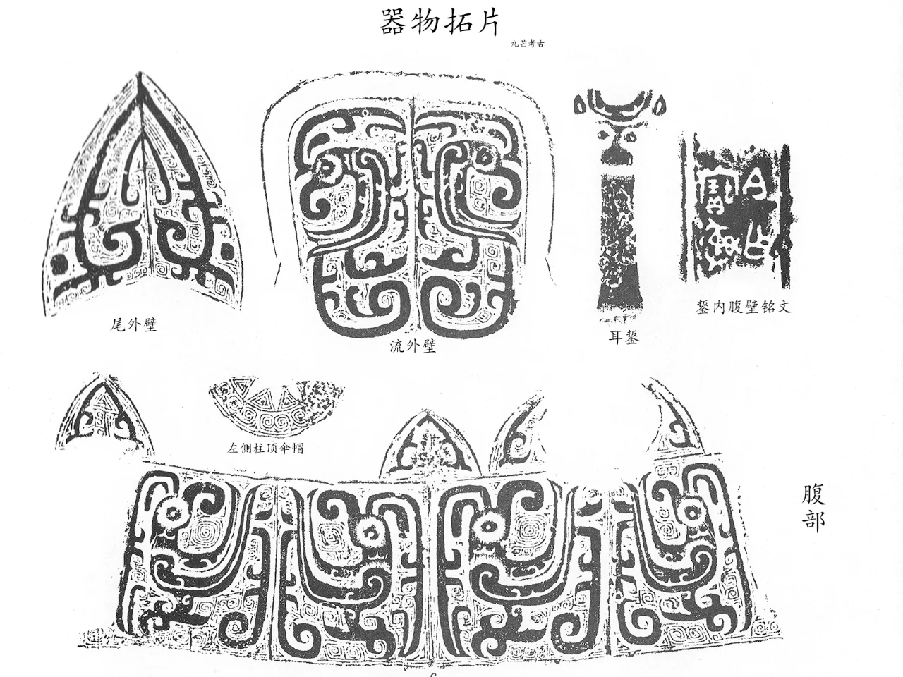 侈口,槽形流上扬,横截面呈”U“字形,尖尾上翘,口、尾外侧均为方唇,口缘前部近流处立伞状双珠,外撇,柱外侧平直,内侧圆弧,横截面呈半圆形,腹身筒状深腹,上腹略束,下腹垂鼓,横截面呈扁圆形,圜底。三棱刀状足,足底锥尖外撇,三足面均有一竖向棱脊,横截面呈三角形(图三)。腹一侧置竖向龙兽首半环形鋬,鋬面两侧棱角分明,鋬下对应一足。伞帽下部饰一周四组三重等边三角纹,下部饰一周卷云纹,均为细阳线。尾下、器身正背面上部各饰一蕉叶纹,内填两只简化变形鸟纹。腹部饰一周大垂冠凤鸟纹,分两组,以流、尾下竖向范线为界,每组二凤鸟,回首相对,凸圆目,目中有凹窝,勾喙,头顶双冠,一长一短,长冠后折而下垂着地,中部出岐,短冠后下垂,短身,身下有一足,足爪尖勾,尾上翘,末端分叉呈鱼尾状,出岐尾,岐尾分两股,上一股较短,末端尖翘,下一股长而下垂着地,中间出岐枝,末端回卷。流部饰两只并列的凤鸟纹,与腹部近同,不同的是身下两足,尾分二股,上股下折,中间出岐,末端上翘而回卷,下一股下折而出岐。鋬上龙兽首凸圆目,目中有凹窝,叶形耳,耳面饰横阴线,两角相连,呈”U“字形,角面饰阴线云纹。整器主纹饰界以细阳线,以细阳线云雷纹衬地。