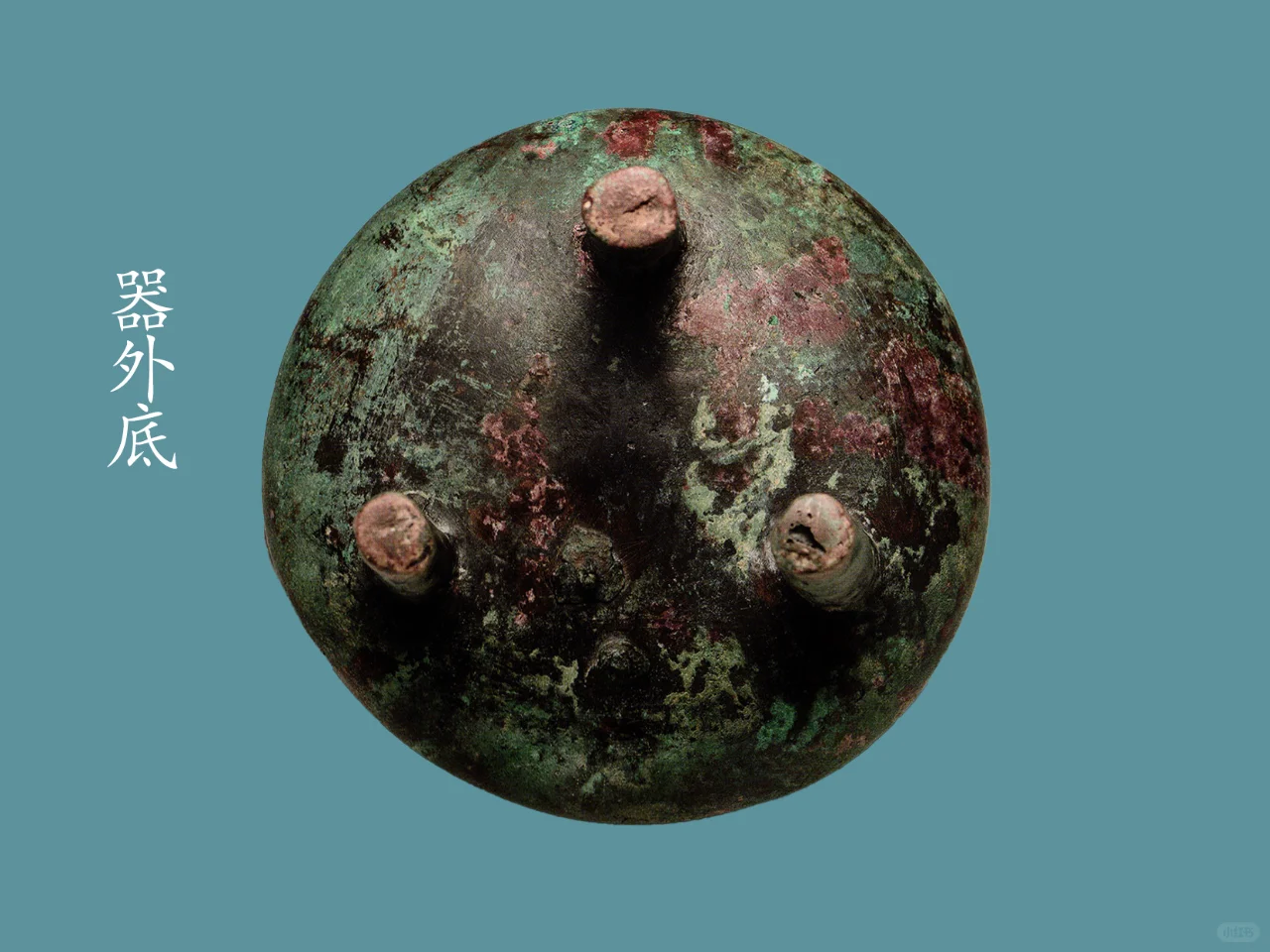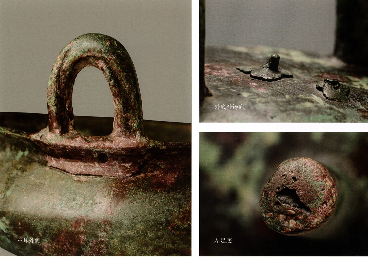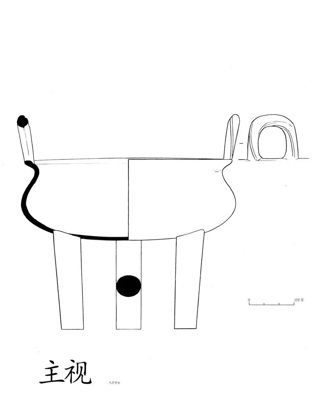 侈口,折沿,尖圆唇,口内侧有一周勾槽,索状双立耳,束颈,浅扁圆鼓腹,圜底,三高圆柱足。