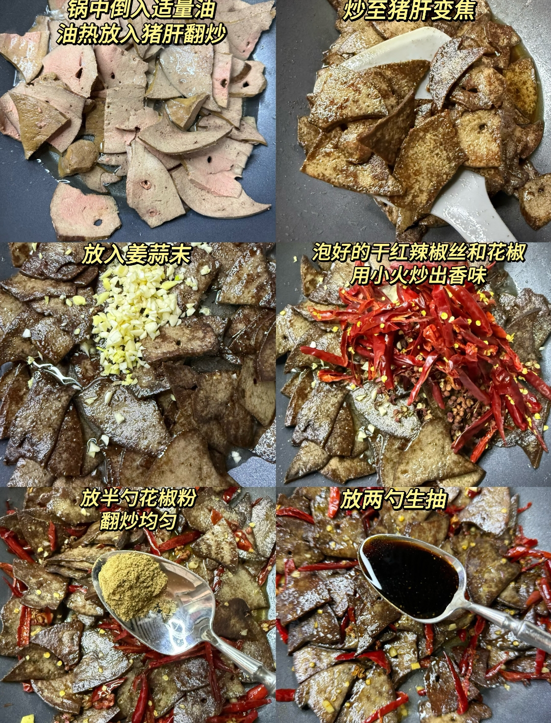 重头戏在猛火宽油中正式拉开帷幕。锅中热油,将切好的猪肝片倾入其中不断翻炒,随着温度的攀升,猪肝表面的水分逐渐蒸发,直至炒出微微焦边,散发出独特的脂香。此时,姜蒜末率先入锅爆香,紧接着下入提前泡软的干红辣椒段与花椒。在高温的激荡下,红亮的辣椒与麻香的花椒疯狂释放着诱人的香气,顺手撒入半勺花椒粉,让这股麻劲在空气中彻底弥漫开来。
