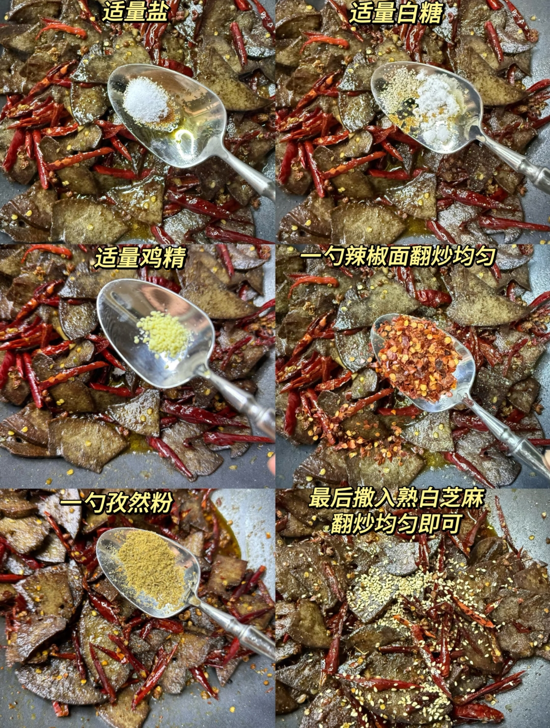 到了调味的决胜时刻,两勺生抽提鲜,适量盐、白糖与鸡精构筑起咸鲜微甜的立体口感,再豪迈地加入一勺辣椒面,让红亮的色泽与火辣的滋味深深烙印在每一片猪肝上。最后,当一勺孜然粉与一把熟白芝麻翻滚入锅的瞬间,整道菜的灵魂被彻底点燃,孜然的异香与芝麻的醇香完美交融,出锅装盘。