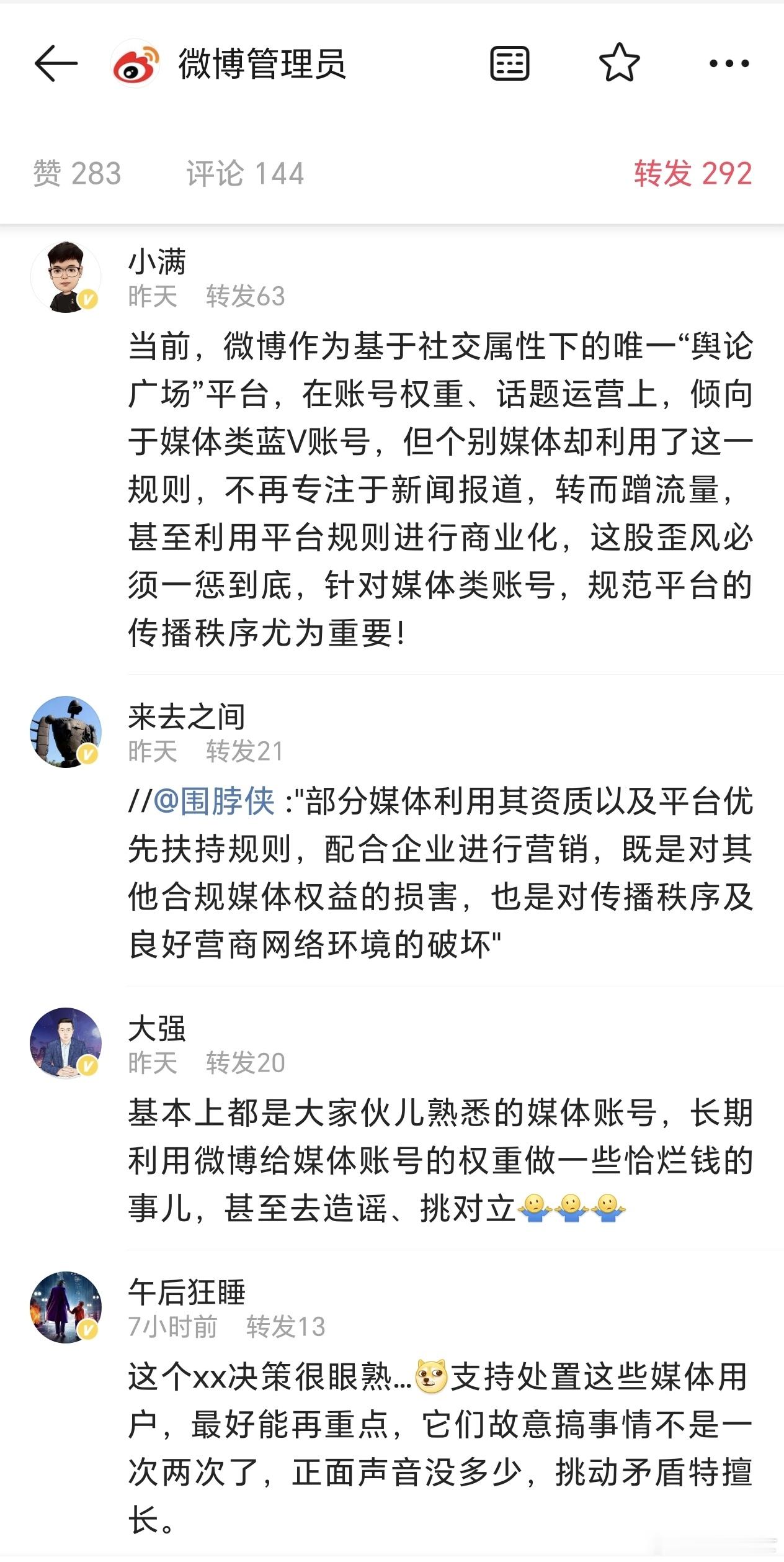 微博终于对蓝V媒体动手了,支持,大力支持,某些媒体活得还不如自媒体,为了流量不择