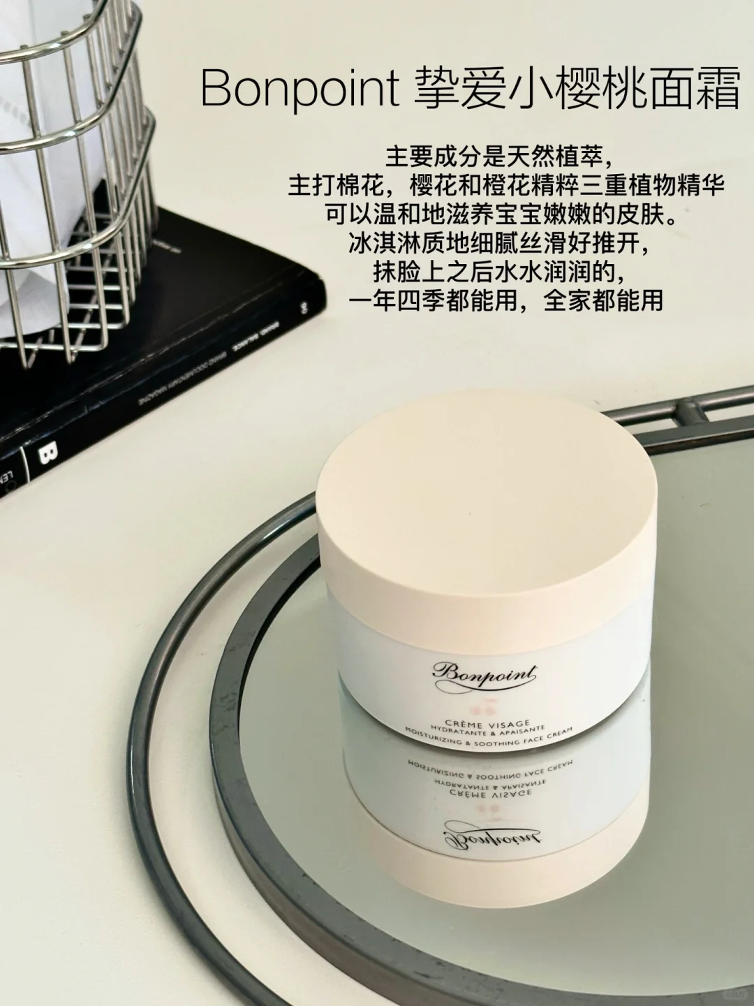 奢侈品牌做面霜,成分和细节都很用心,主要成分是天然植萃,是Bonpoint家的核心成分,蕴含棉花,樱花和橙花精萃,补水保湿,舒缓呵护,温和滋养宝宝嫩嫩的皮肤。天然橙花馨香,舒缓身心。冰淇淋质地细腻丝滑好推开,抹脸上之后水水润润的,营养嗖嗖嗖争先恐后地润到宝宝皮肤里去了,一年四季全家都能用,能满足大部分肌肤需求。