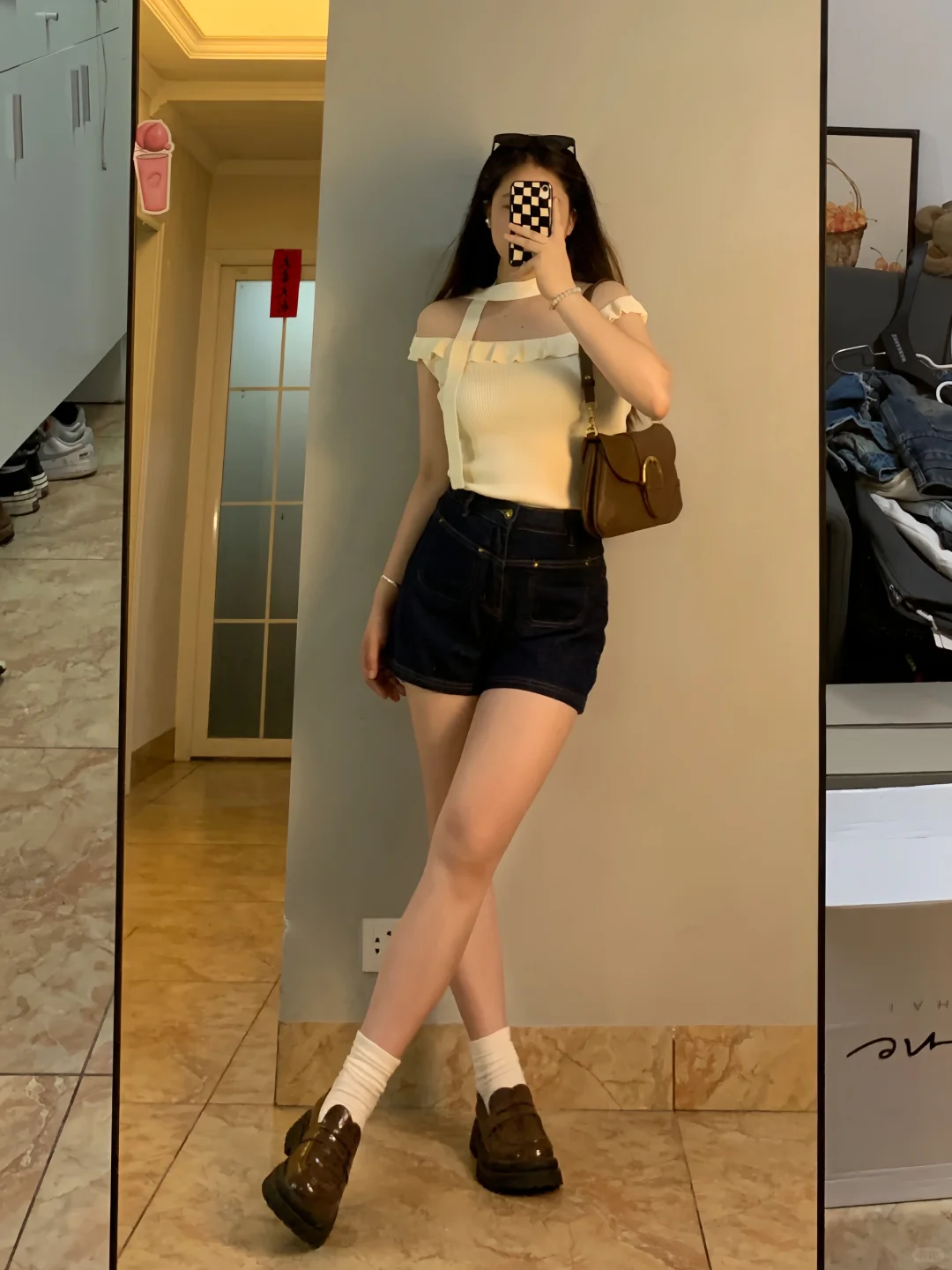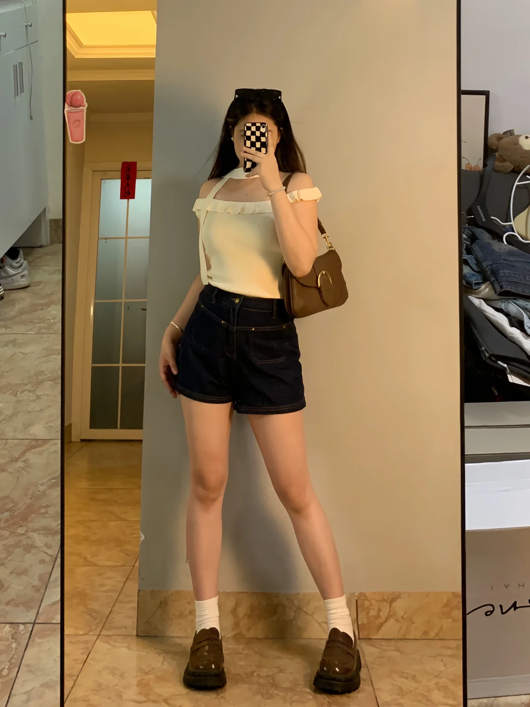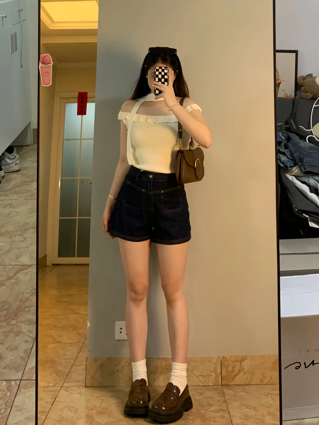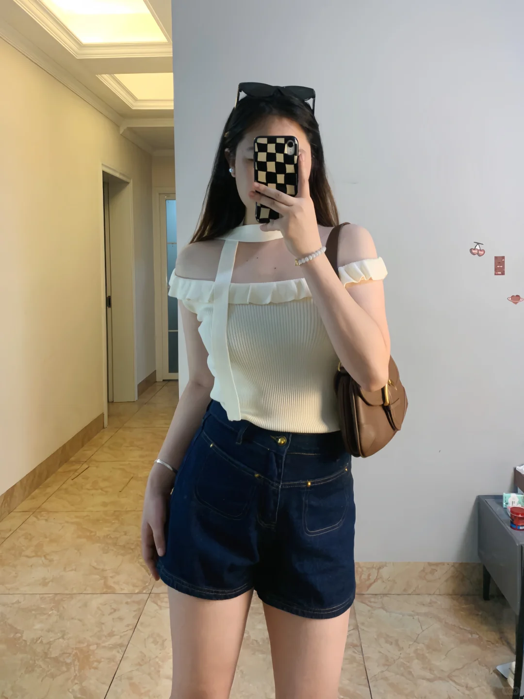 有点小精致的感觉 一字肩➕短裤辣飞飞咯